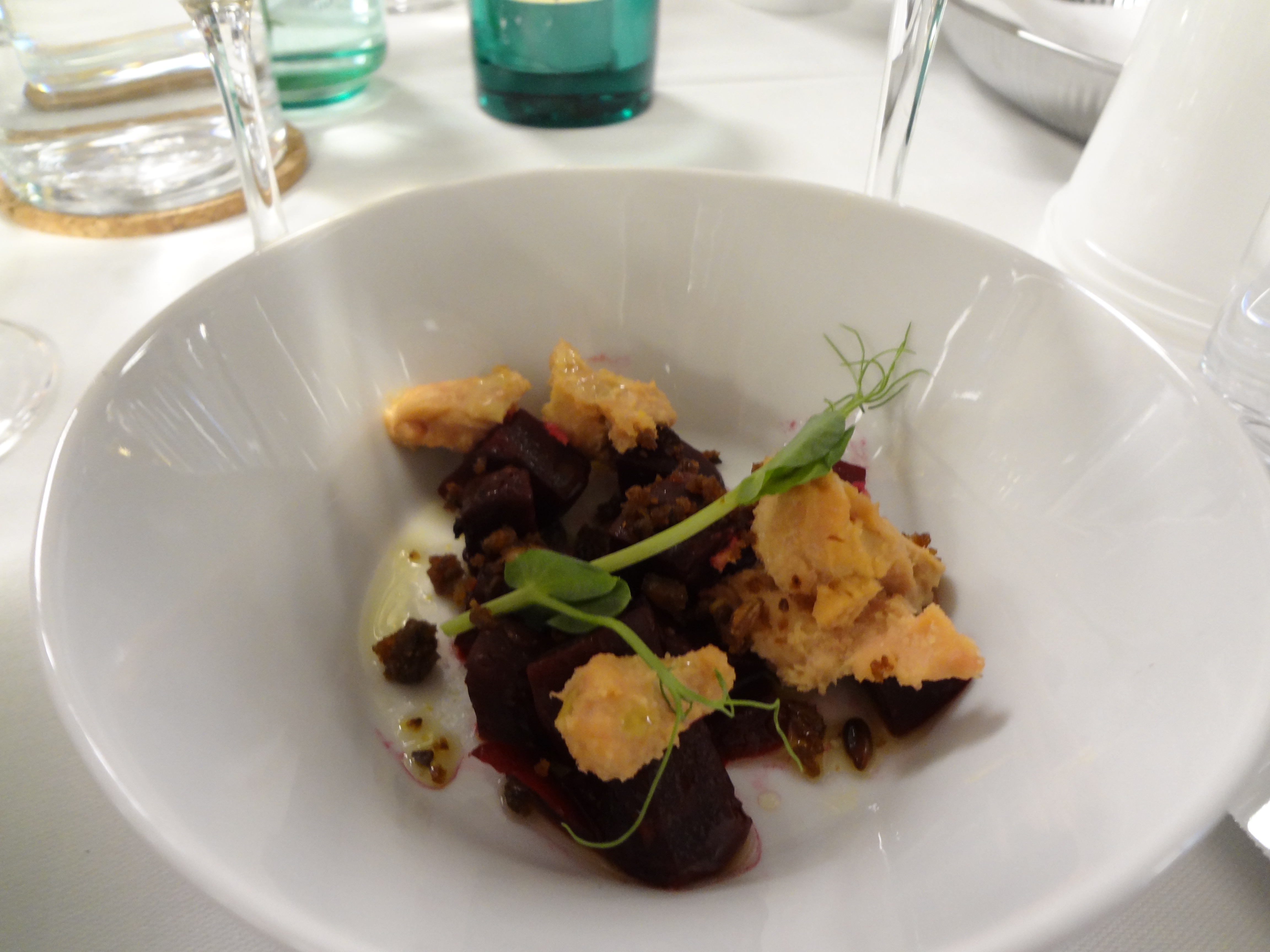 Bollinger Rosé (7755) 499:-med kokta rödbetor i apelsinvinägrett med smulad anklever och rågsmulor. Här matchar frukten i rosén de lite söta betorna.