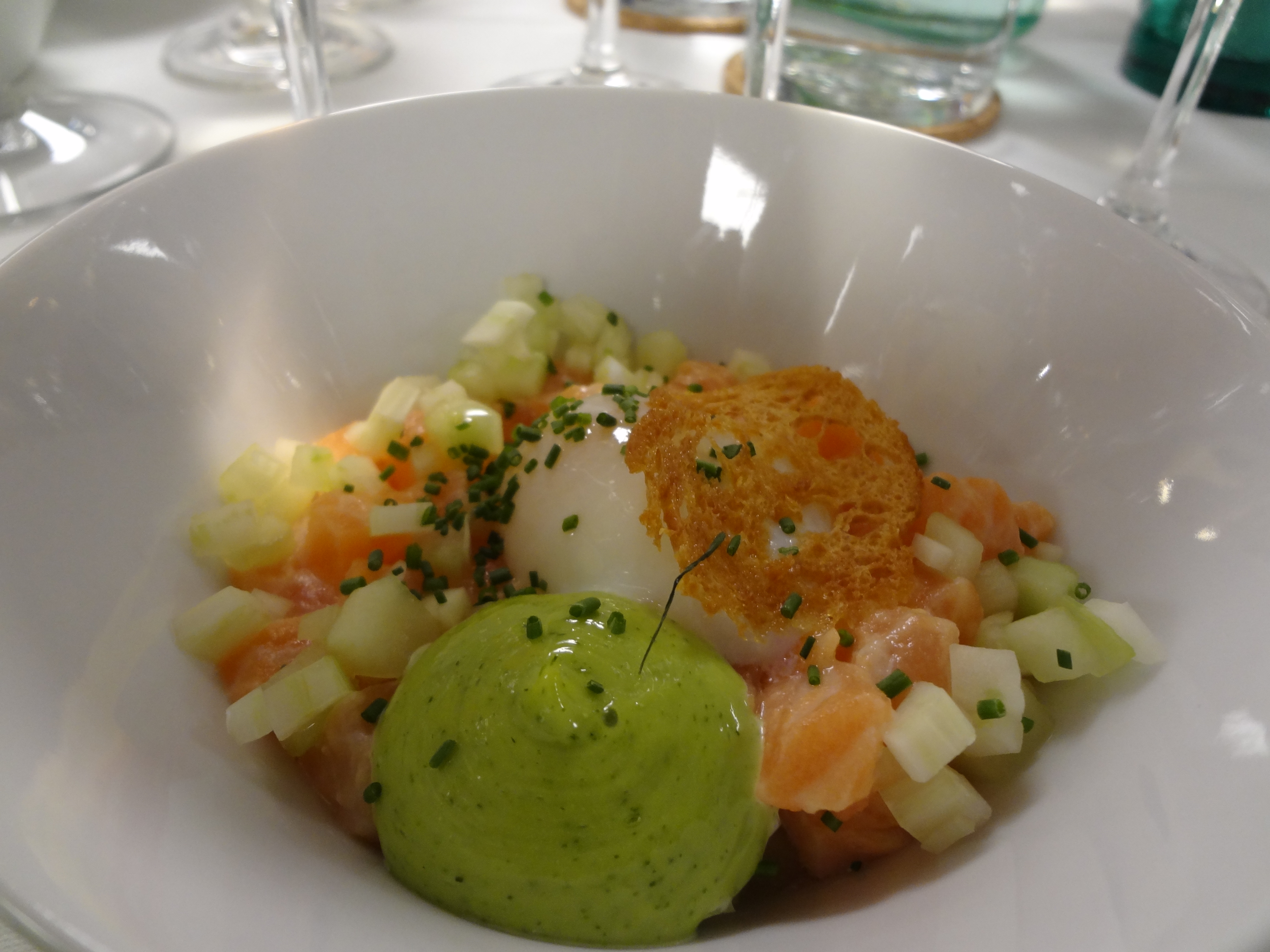 Ayala Brut Nature (81438) 349:- & Ayala Blanc de Blancs 2005 (81978) 489:- med Citrusmarinerad Salmalax och sensommargrönsaker med 64 – gradigt ägg, dillkräm och skorpa. Här tonar den friska syran i rätten ner de friska syrorna i vinet. Två olika typer av vin som bägge passar till denna rätt.