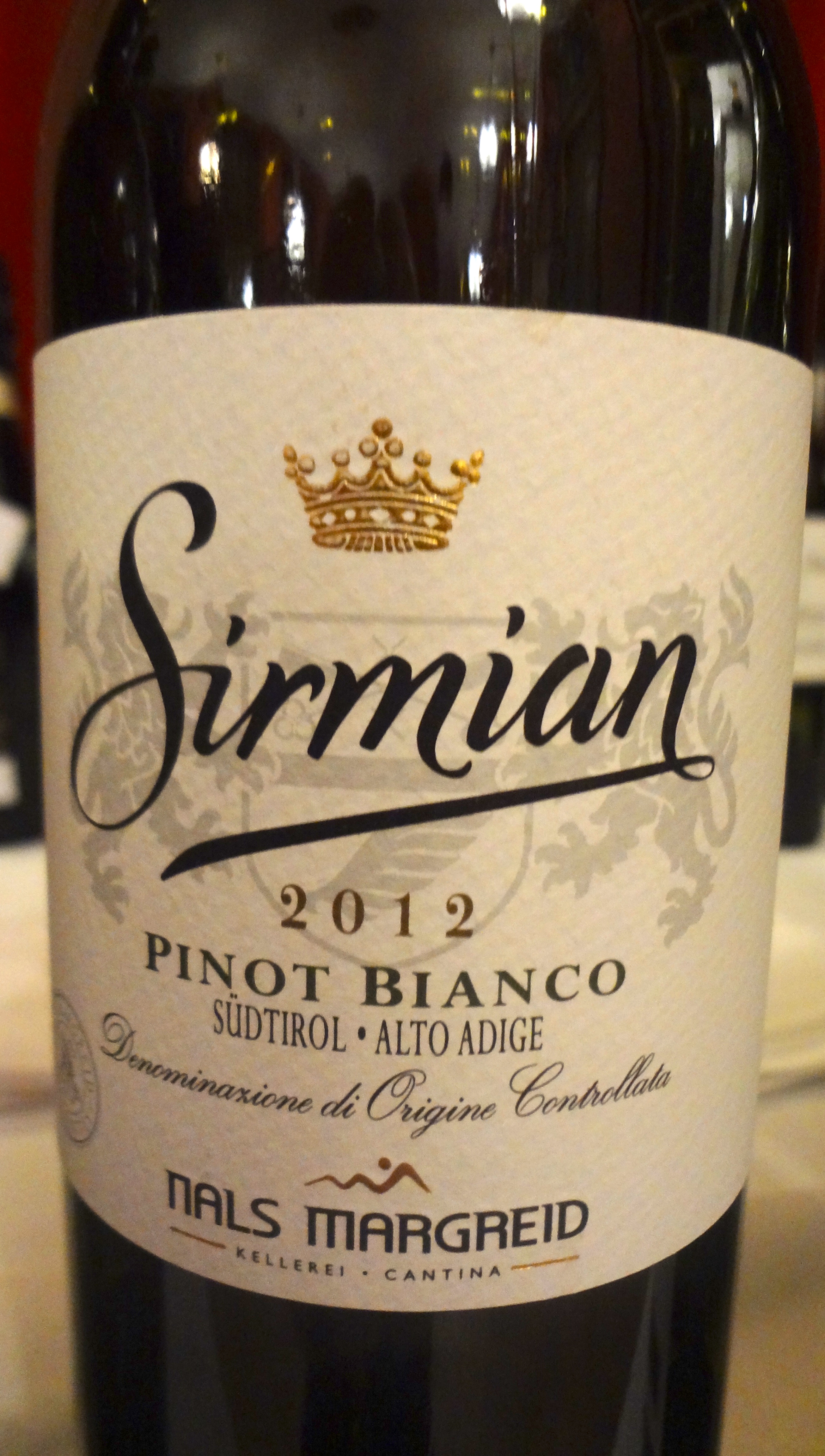 A.A. Pinot Bianco Sirmian 2012, producent Nals Margreid. Detta vin fick utnämningen ”White Wine of the year” och kommer från distriktet Alto Adige som gränsar till Österrike. Tre glas. Ett fylligt och elegant vin med bra syra, doft och smak av äpple, blommor och en hint av ananas.