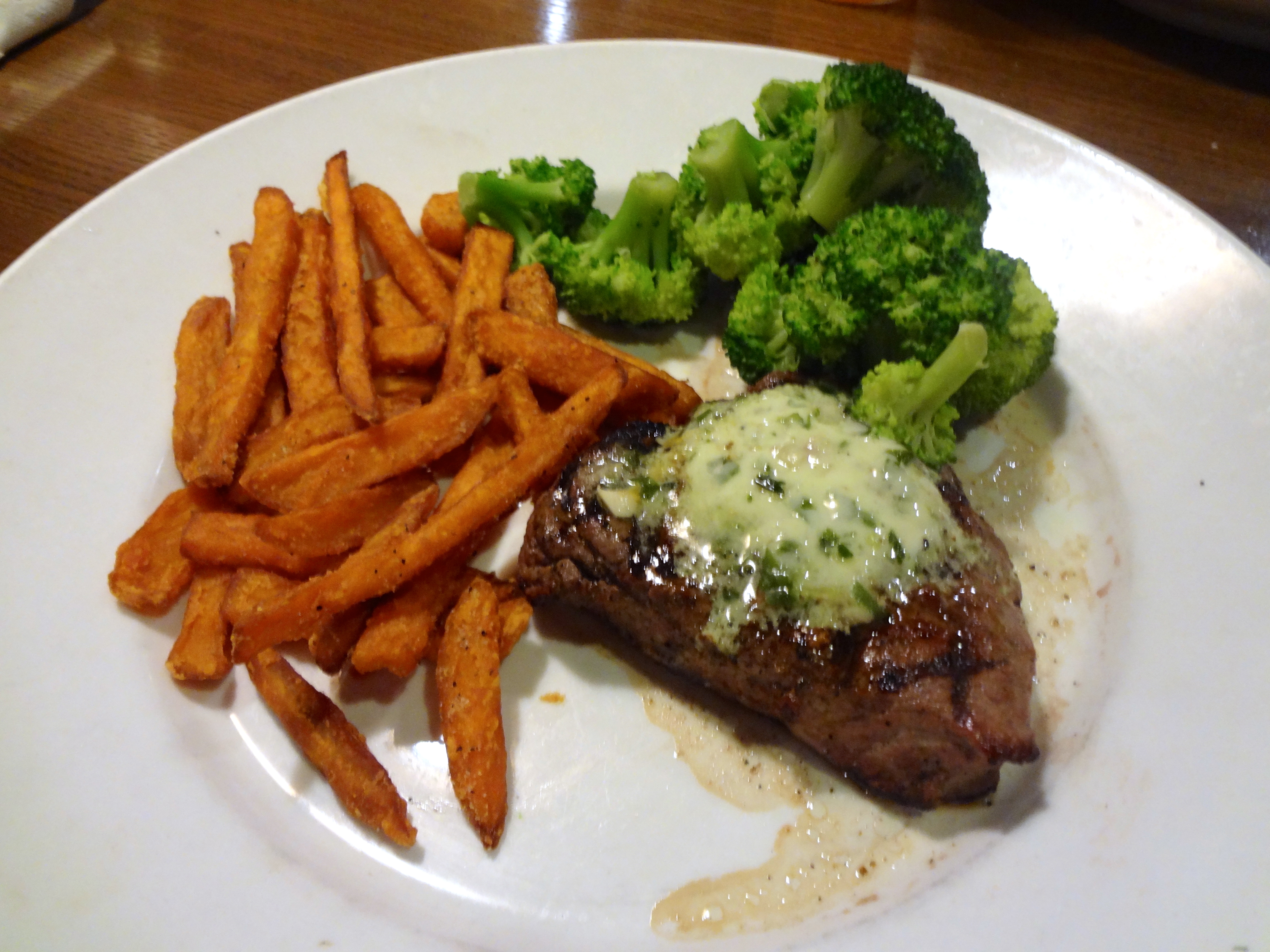 ”Flat iron steak” med två valfria tillbehör, här ”sweet potato fries” och broccoli.