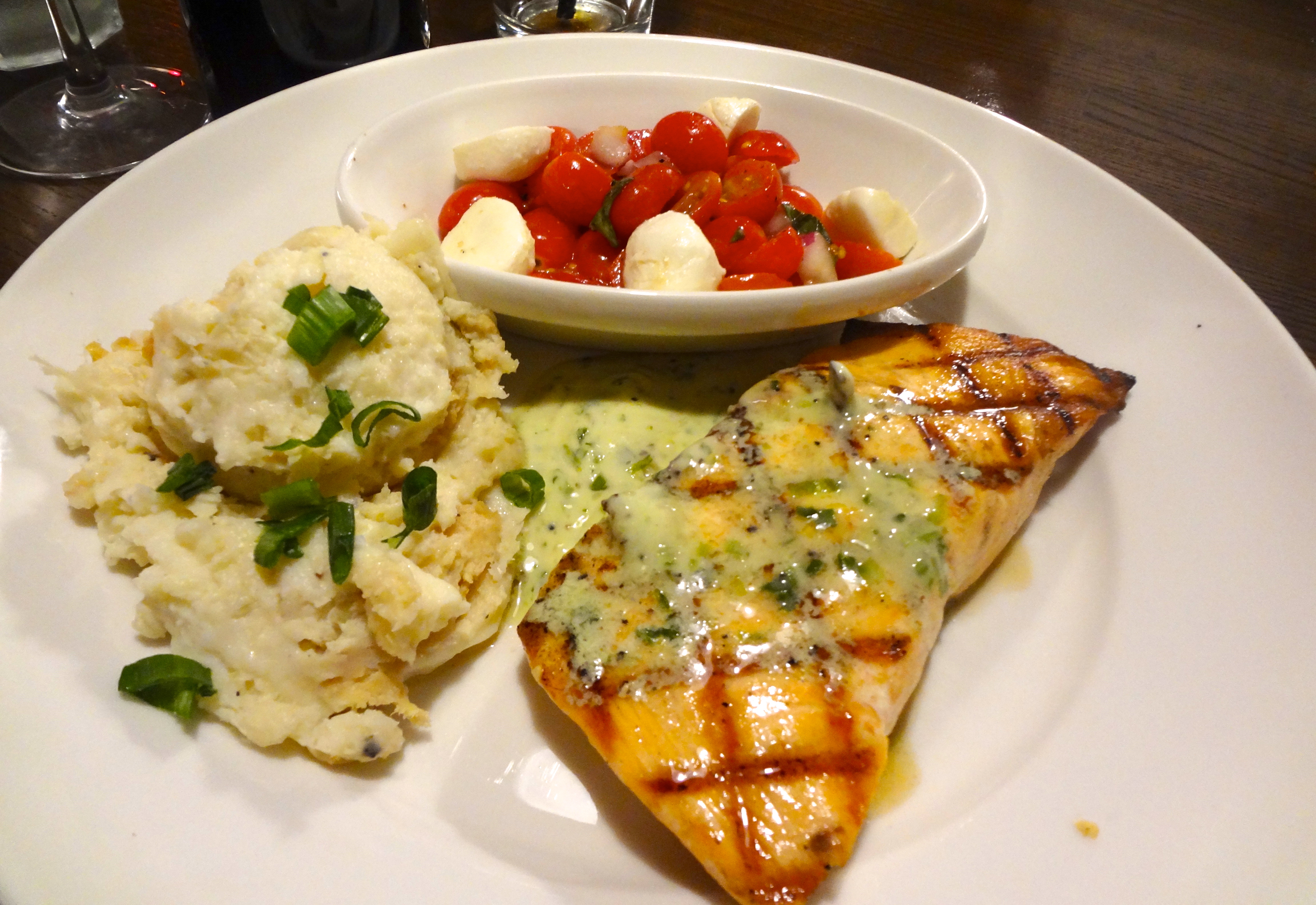 Grillad lax med potatismos och tomat- och mozzarellasallad.