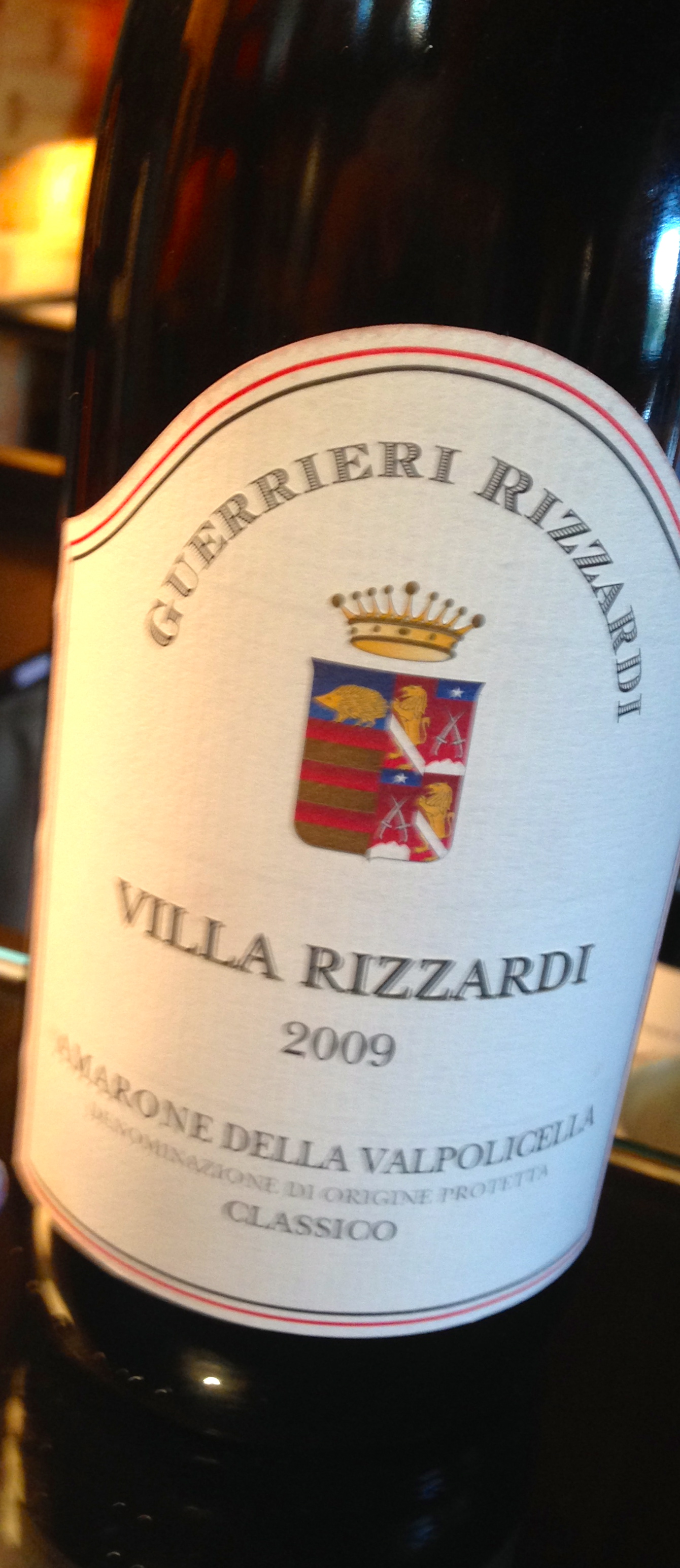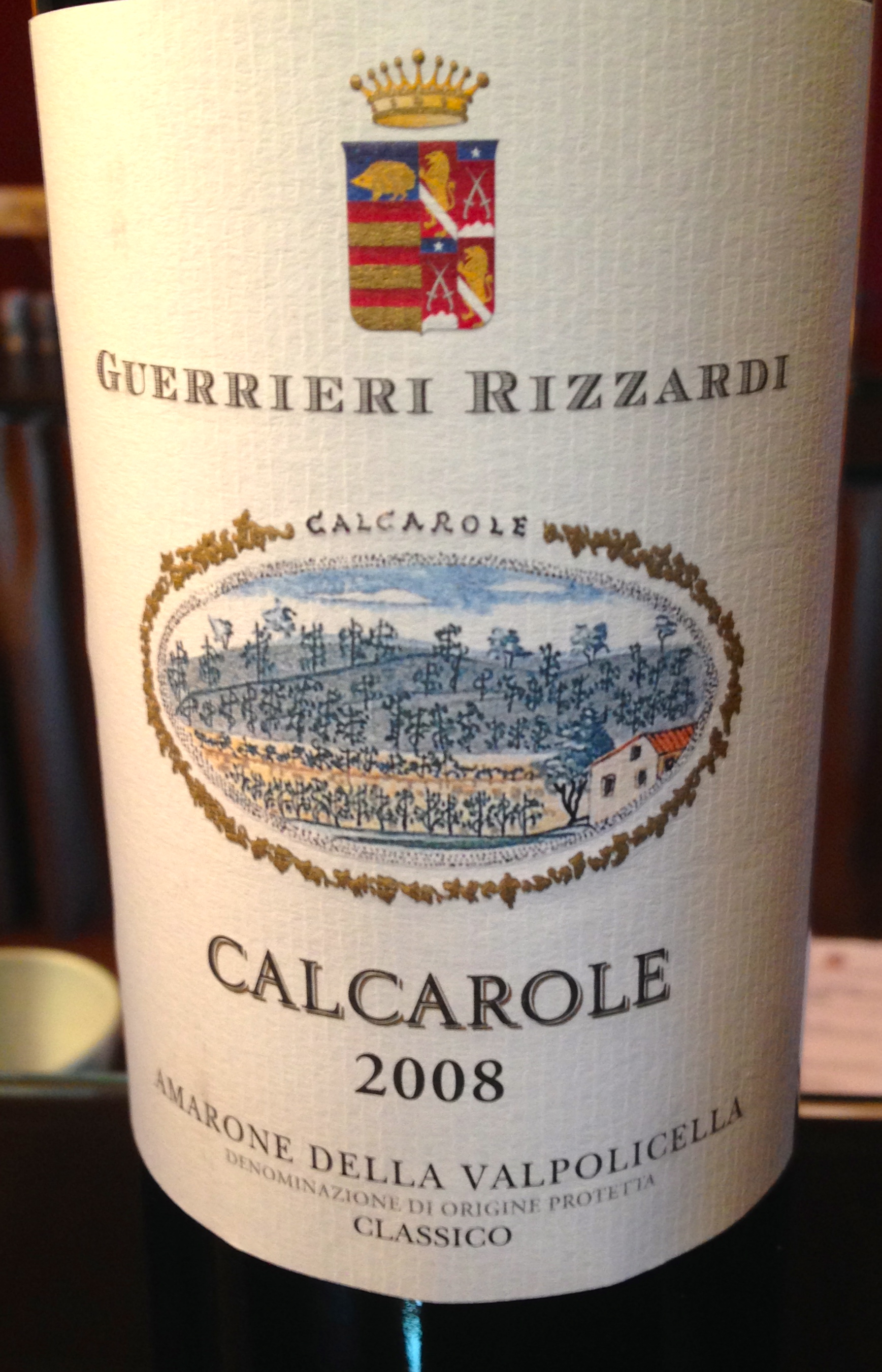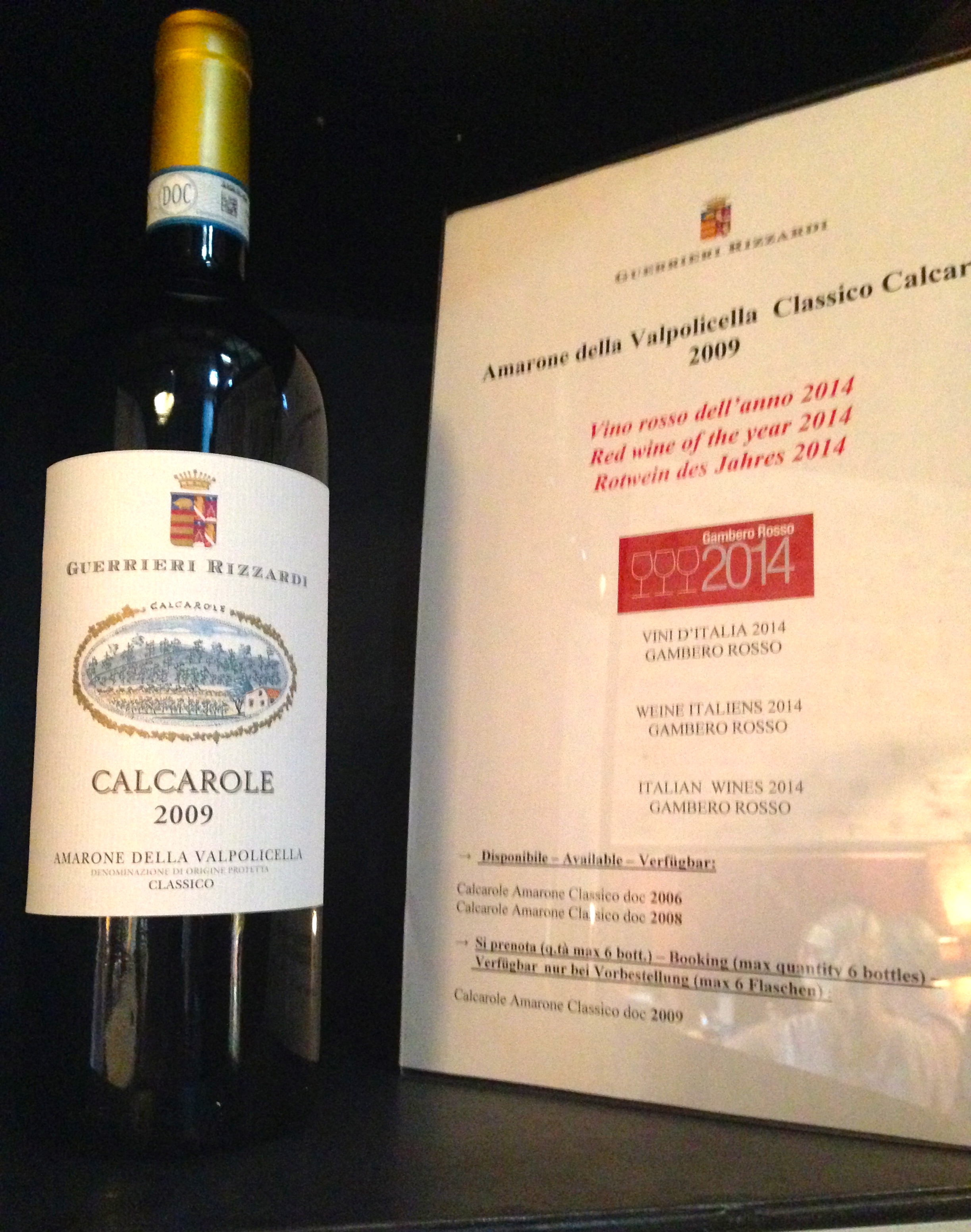 Calcarole Amarone della Valpolicella Classico DOC 2009. Pris 63 Euro. Vinet har fått 3 glas av Gambero Rosso och utsågs även till ”Red wine of the year 2014”. Druvor Corvina 60%, Corvinone 17%, Sangiovese 10%, Barbera 10% och Rondinella 3%. Hög alkoholhalt 16,72%. Det producerades 13.000 flaskor. Doft av katrinplommon, fat och mörka körsbär. Smak av mörka bär, fat och beska i avslutet. Bör dekanteras och vinner på att lagras några år.