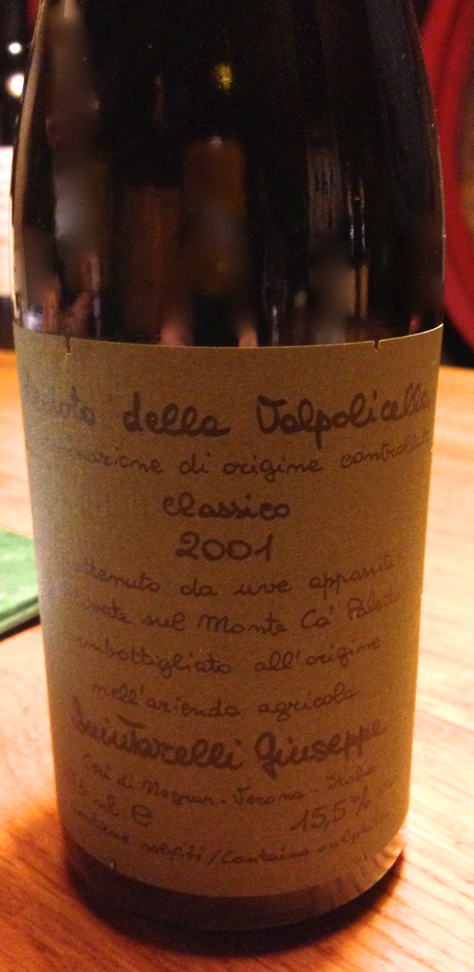 Recioto della Valpolicella Classico DOC 2001. Pris 170.- Euro. Druvor 55% Corvina och Corvinone, 30% Rondinella och 15% Cabernet, Nebbiolo, Croatina och Sangiovese.. De druvor som växer högst upp och som får mest sol används till Recioto. Recioto var mycket viktigt för Giuseppe (”Bepi”) och den görs bara bra år, vilket inträffar ca vart tredje år. Senast den gjordes var 2001 och nästa årgång som kommer är från 2004. Smaken och doften är elegant och bra balanserad med inslag av mogna plommon och mogna körsbär.