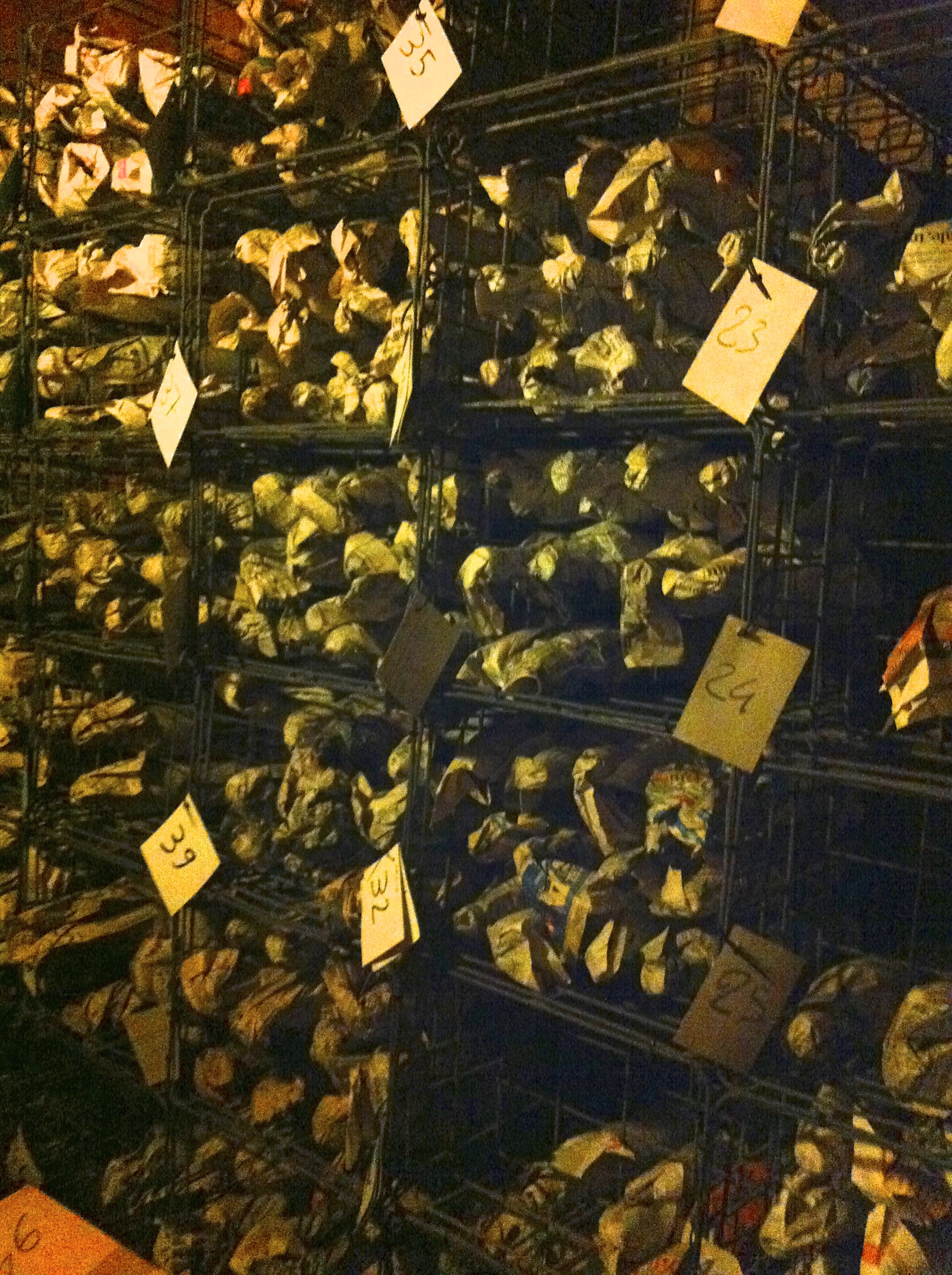 Här lagras olika årgångar av vinerna. Varje flaska är inlindad i tidningspapper.
