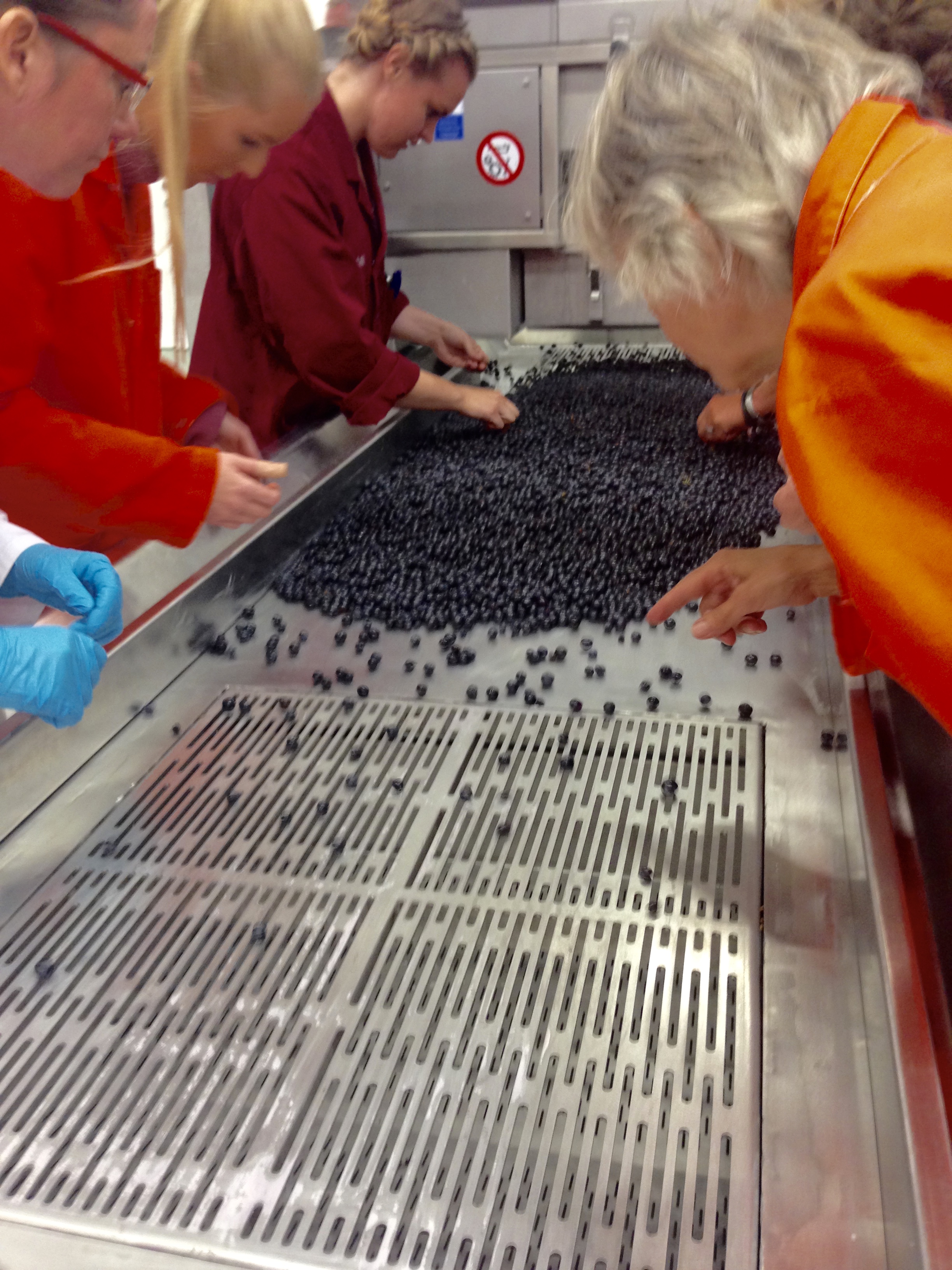 Därefter åker druvorna hiss upp och faller ner i avstjälkningsmaskinen och ut rullar sedan varenda druva, var för sig, till nästa granskning. Jag undrar i mitt stilla sinne hur maskinen klarar av att få dem så fina utan att de skadas. Nu börjar fingranskning av druvorna och enstaka druvor plockas bort som inte håller måttet.