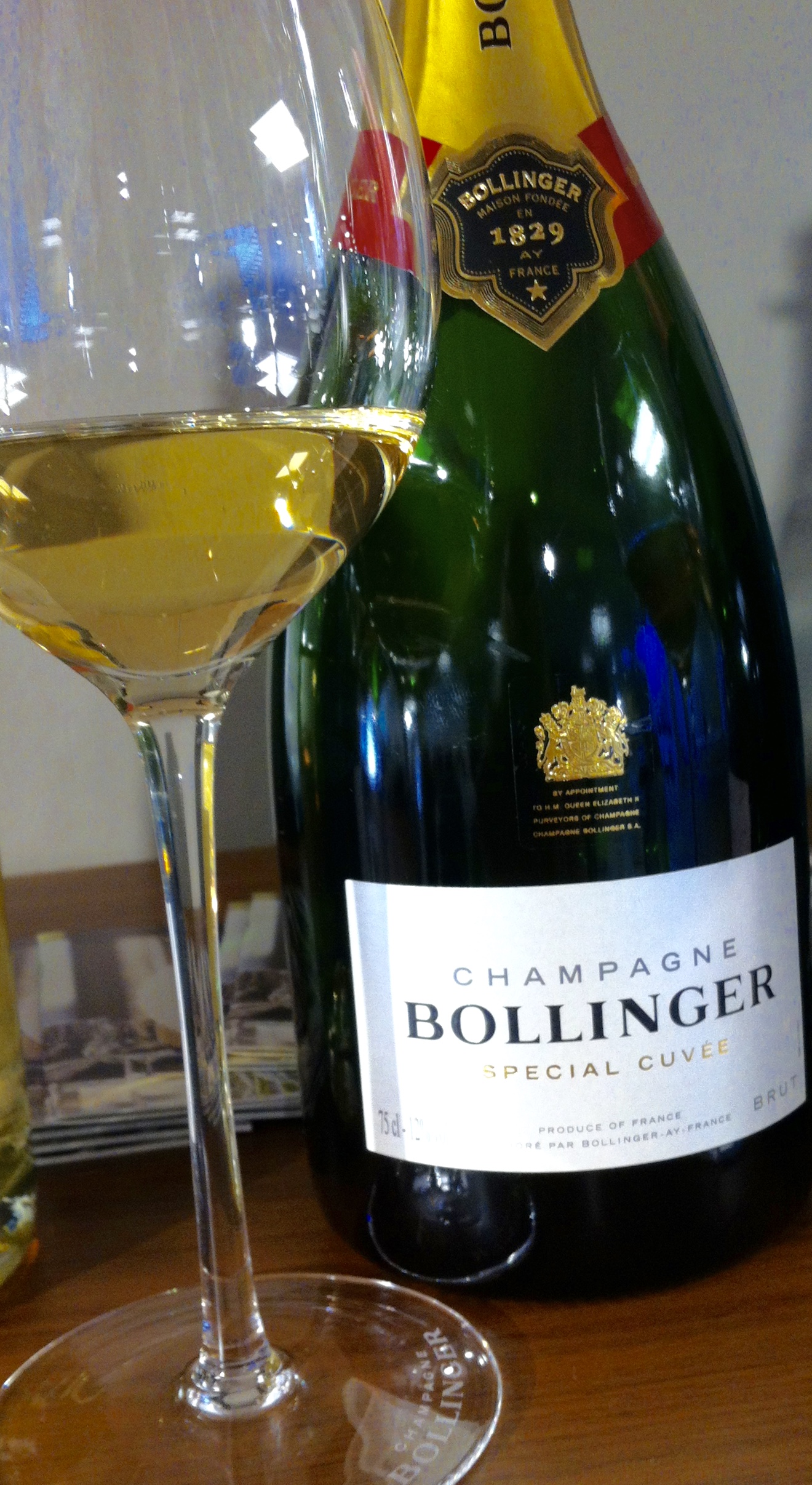 BOLLINGER SPECIAL CUVÉE BRUT FS(7418) 449 kronor, 75 cl. Druvor: Pinot Noir 60%, Chardonnay 25% och Pinot Meunier 15%. Doft och smak av röda äpplen, nougat och en lätt rostad ton. Bollinger passar utmärkt till mat, allt från fisk och skaldjur till fågel och ljusa kötträtter. Om ni vill läsa mer om mat som passar till Bollinger kan ni läsa här