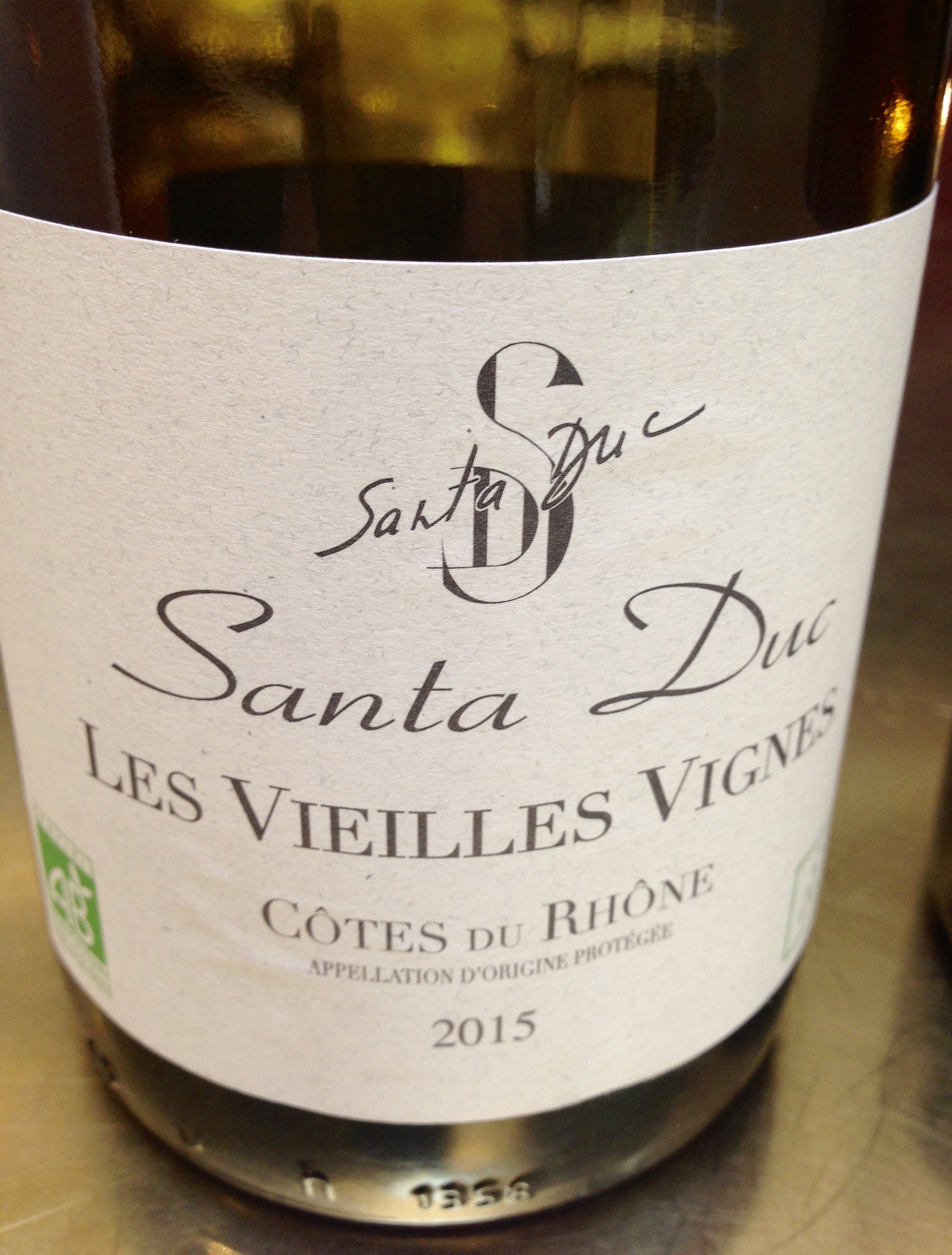 Santa Duc Les Vielles Vignes 2015 FS (73018). Ekologiskt rött vin. Frankrike, Côtes du Rhône 118 kronor, 75 cl, alkoholhalt 14,5%. Druvor: Grenache 75%, syrah 20% och cinsault 5%. Doft och smak av körsbär, blåbär, skogshallon och lite örter. Passar bra till lamm och rätter gjorda på nötkött.