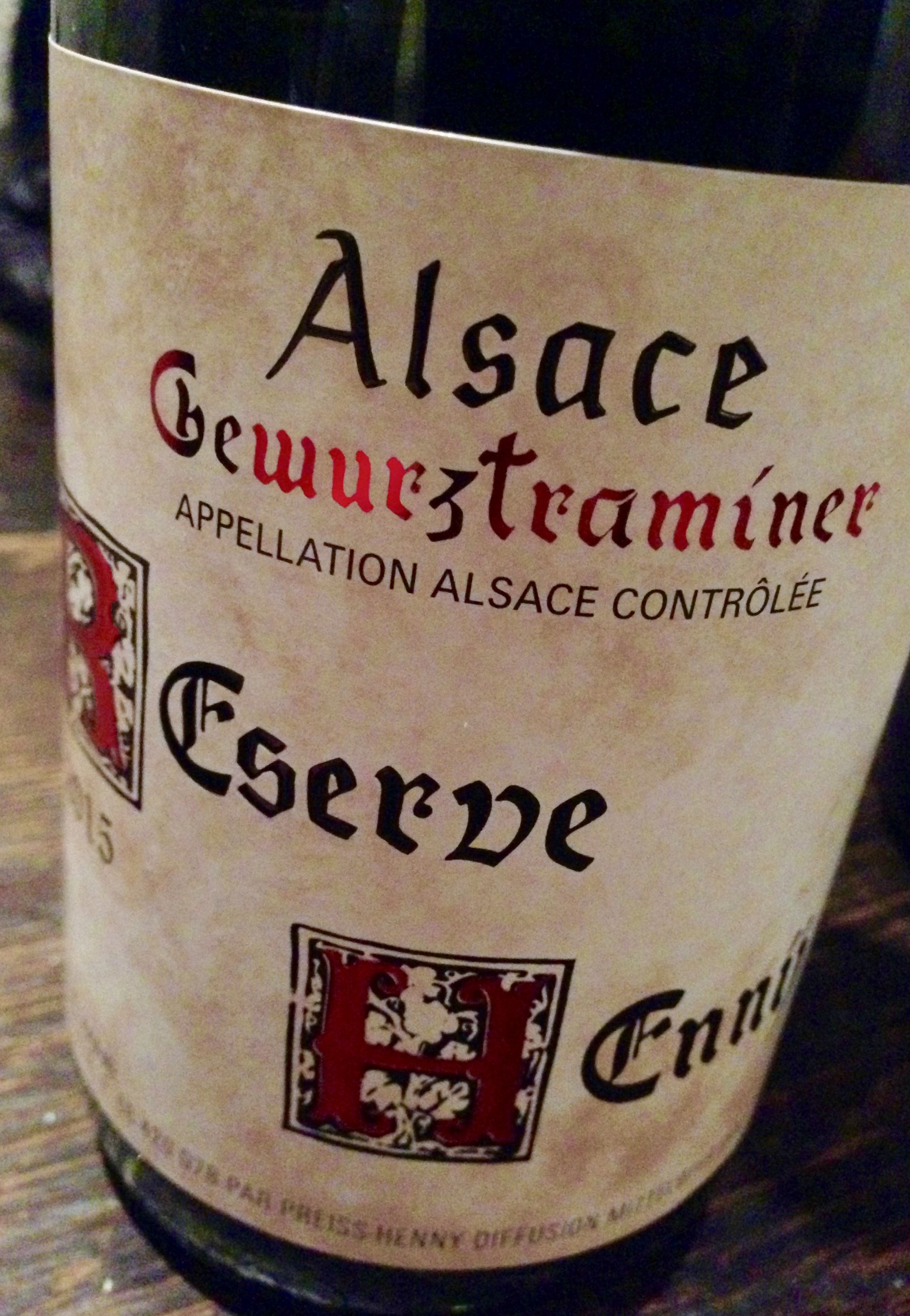 Gewürtztraminer Réserve Hennÿ 2015 FS (2176). (Vitt vin) Frankrike, Alsace 139 kronor, 75 cl, alkoholhalt 13,5%. Druva: Gewürztraminer. Ett blommigt, kryddigt vin med inslag av litchi, persikor och honung. Passar till fisk och ljusa kötträtter. Prova även till matjesill med bryntsmör.