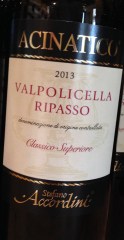 Acinatico Valpolicella Classico 2013 på druvorna Corvina Veronese 60%, Corvinone 15%, Rondinella 20% och Molinara 5%. Här används inga torkade druvor utan först jäser man fram ett vin som liknar basvalpolicellan, sedan får detta jäsa en andra gång ihop med skalrester från Amarone i ca tio dagar. Därefter ligger vinet tolv månader på franska ekfat och sex månader på flaska. I doft och smak hittar du körsbär, plommon lite torkad frukt och en lätt vaniljton. Pris 11,5 Euro. Vinet fanns tidigare i Sverige och kostade då 195 SEK.
