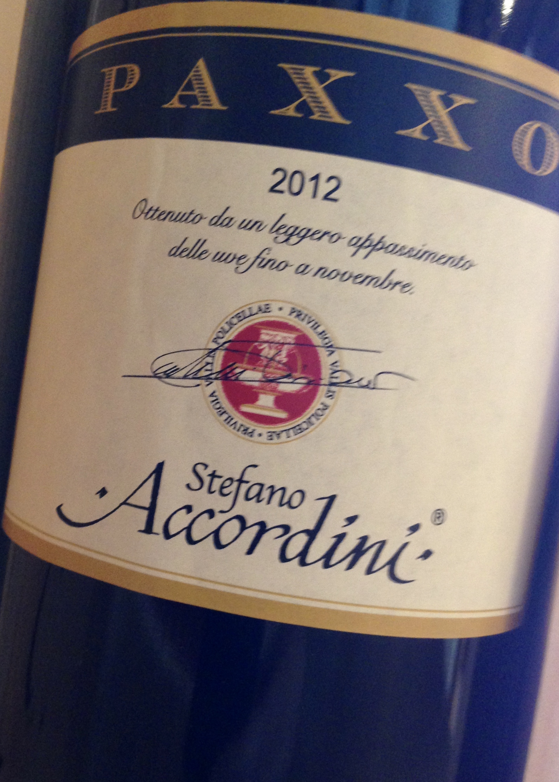 Paxxo Rosso Del Veneto IGT 2012, druvor Corvina Veronese 60%, Rondinella 10%, Cabernet Sauvignon 20% och Merlot 10%. Det här är ett av Paolos favoritviner. Det produceras ca 6000 flaskor per år. Vinet är gjort på druvor som har torkat i en månad och som därefter får ligga tolv månader på franska fat och sex månader på flaska. Det här vinet har fatkaraktär och mer tanniner. Doft av mörka bär och lite kryddor. I smaken finns mörka bär, plommon och kryddor. Pris 14 EUR.