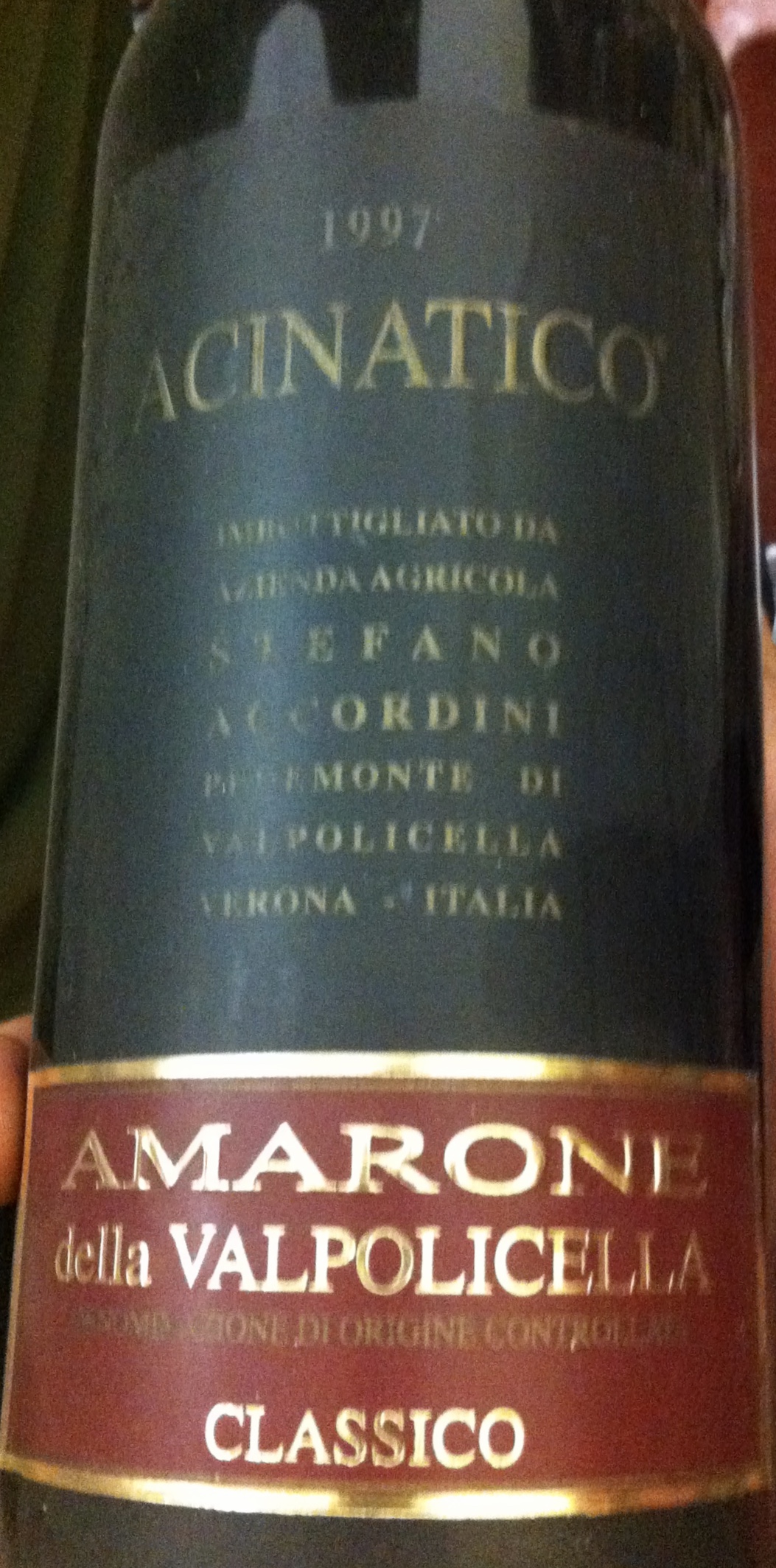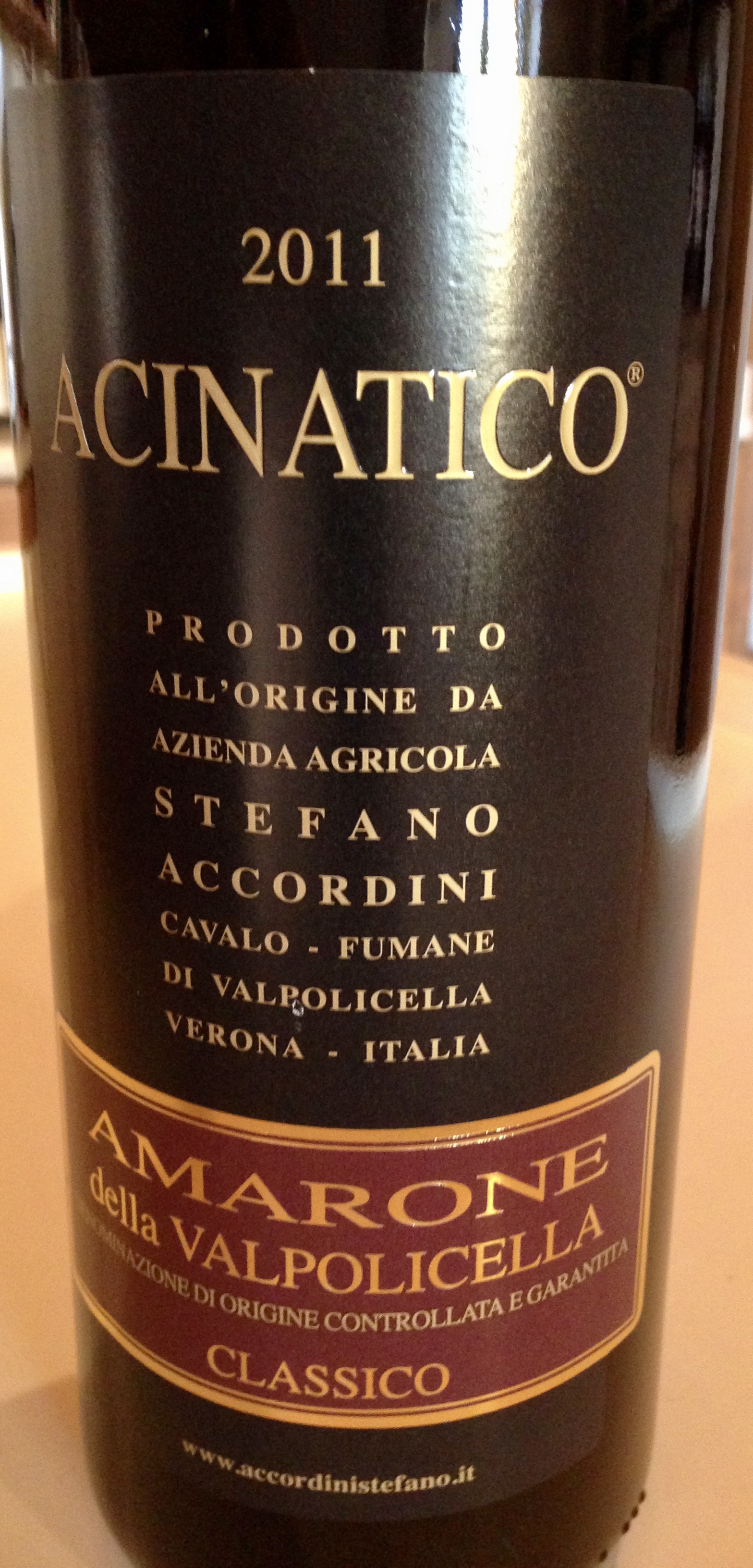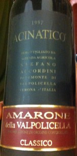 Acinatico Amarone della Valpolicella 2011, druvor Corvina Veronese 75%, Rondinella 20% och Molinara 5%. Druvorna har fått torka i fyra månader därefter ligger vinet på nya franska fat i två år och åtta månader på flaska. Doft och smak av mogna körsbär, plommon, torkad frukt och lite fat. Pris 30 EUR. Vinet fanns tidigare i Sverige och kostade då 403 SEK.