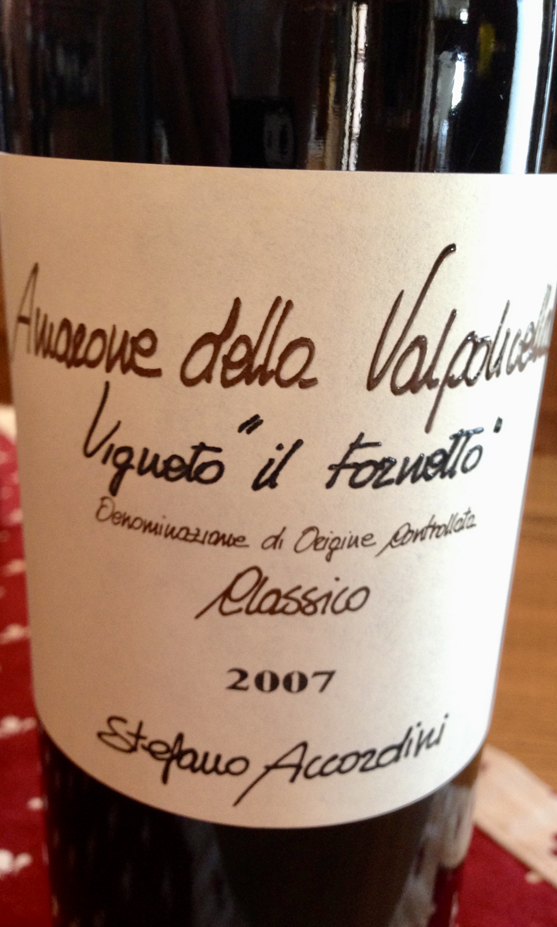 Vigneto il Fornetto Amarone 2007, druvor Corvina Veronese 75% och Corvinone 25%. Det här är deras toppamarone som produceras i små kvantiteter endast de bästa åren. Druvorna torkas i 140 dagar därefter ligger de på franska fat i tre år och ett år på flaska. Doft och smak av mörka körsbär, plommon, torkad frukt och lite mörk choklad. Pris 61 EUR då den fanns i Sverige 741 SEK.