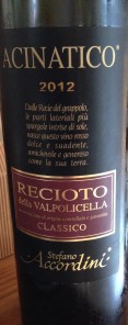 Acinatico Recioto della Valpolicella 2012, druvor Corvina Veronese 75%, Rondinella 20% och Molinara 5%. Druvorna torkas i fyra månader därefter ligger de på fat i fyra månader och tre månader på flaska. Doft och smak av mörka bär och torkad frukt. Sockerhalten 120 gr. Pris 20 EUR.