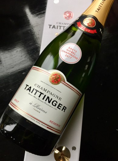 Taittinger Brut Réserve (7422) 405 kronor. Den här champagnen fick årets nobelgäster avnjuta till förrätten. Den passar att servera även till nyårsmiddagen förslagsvis till skaldjur och hummer. Doft och smak av citrus, röda äpplen och brioche.