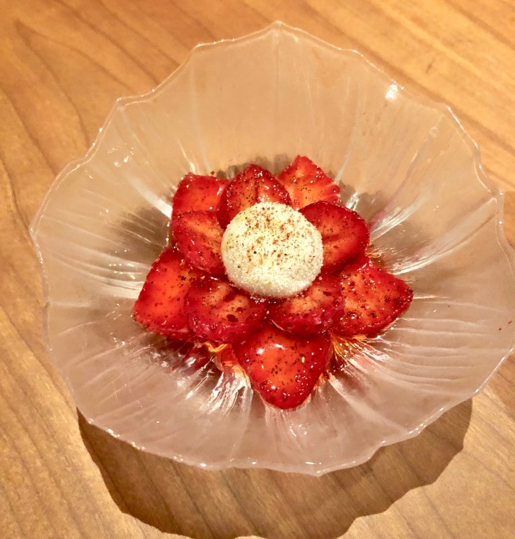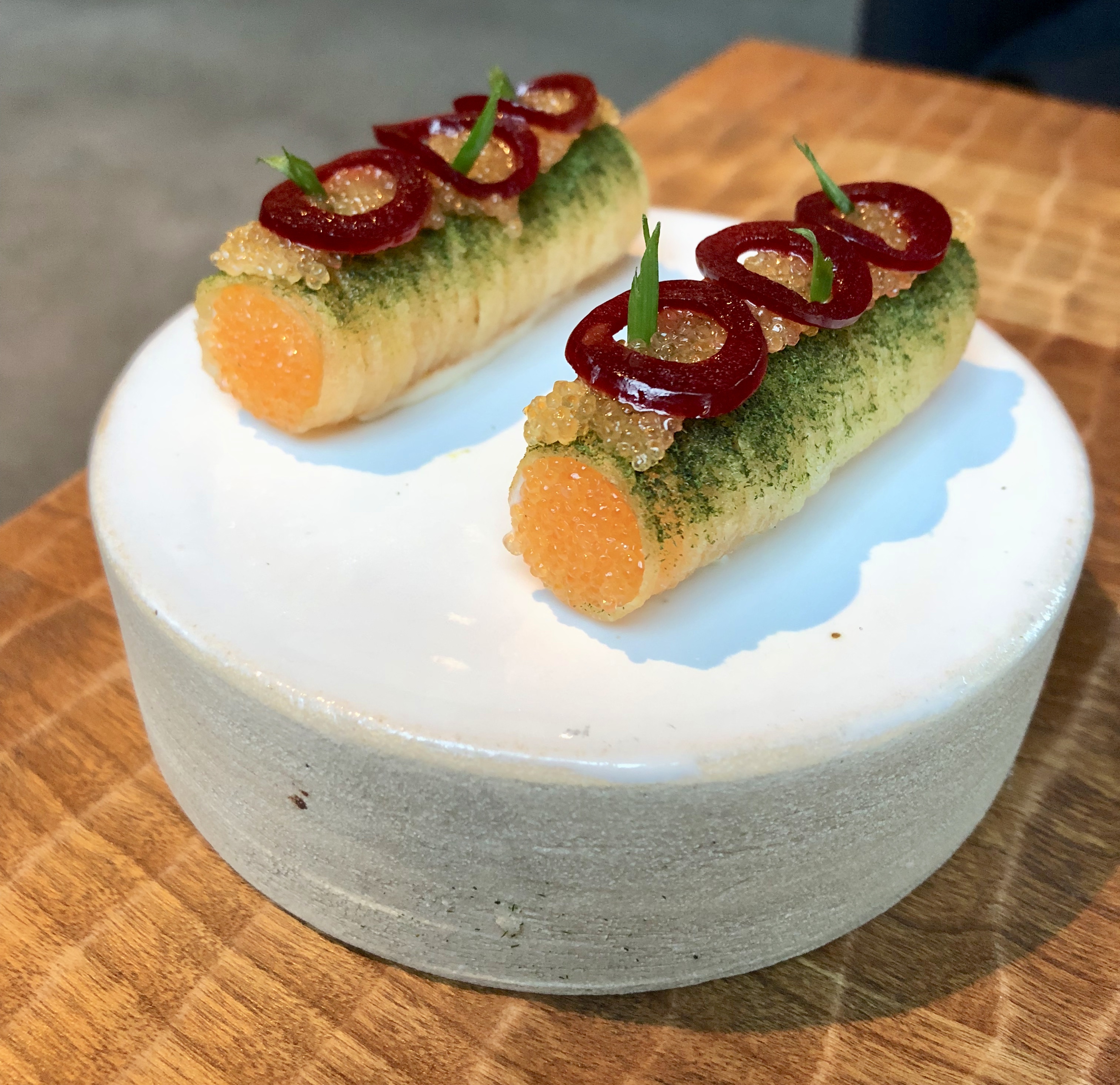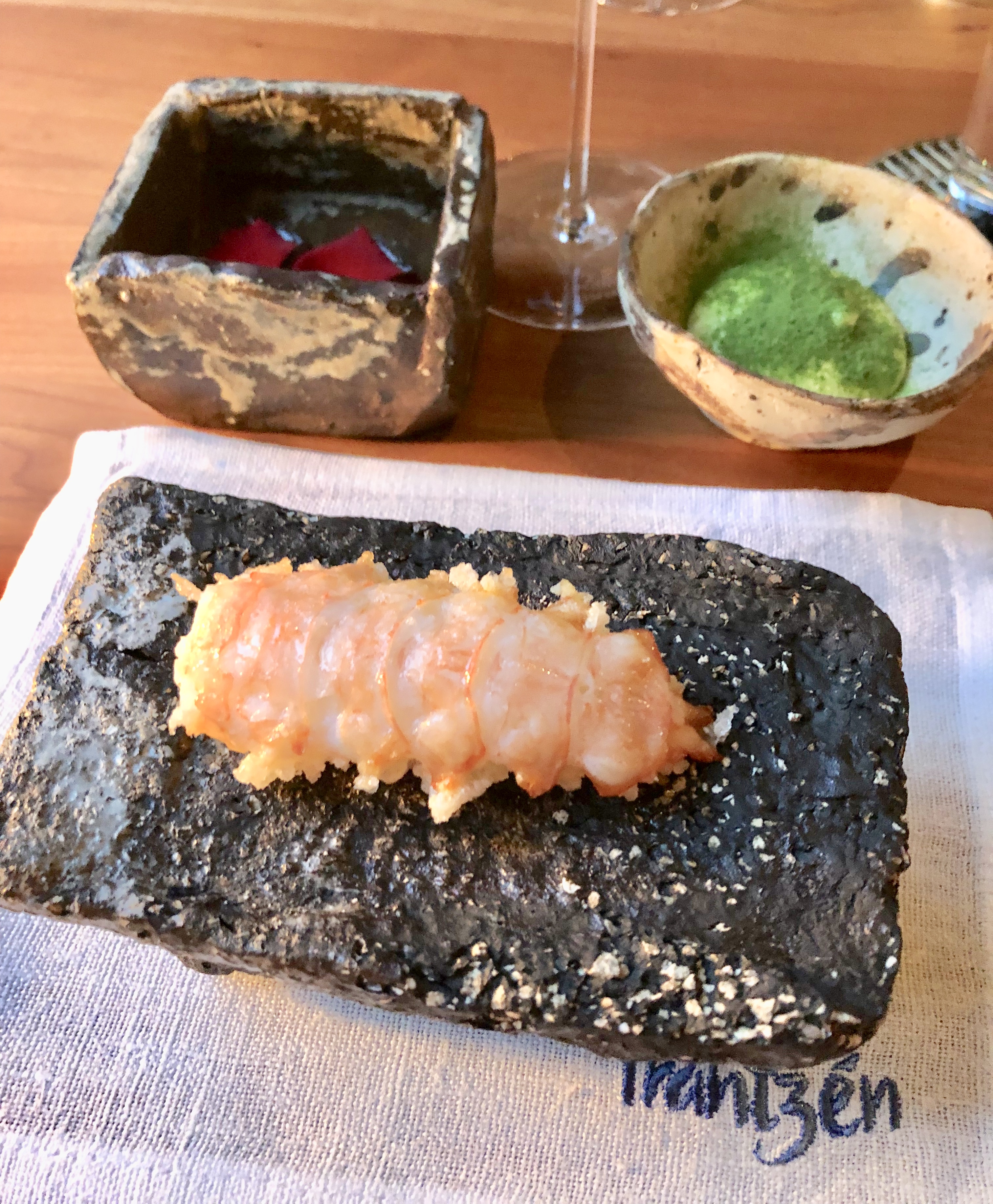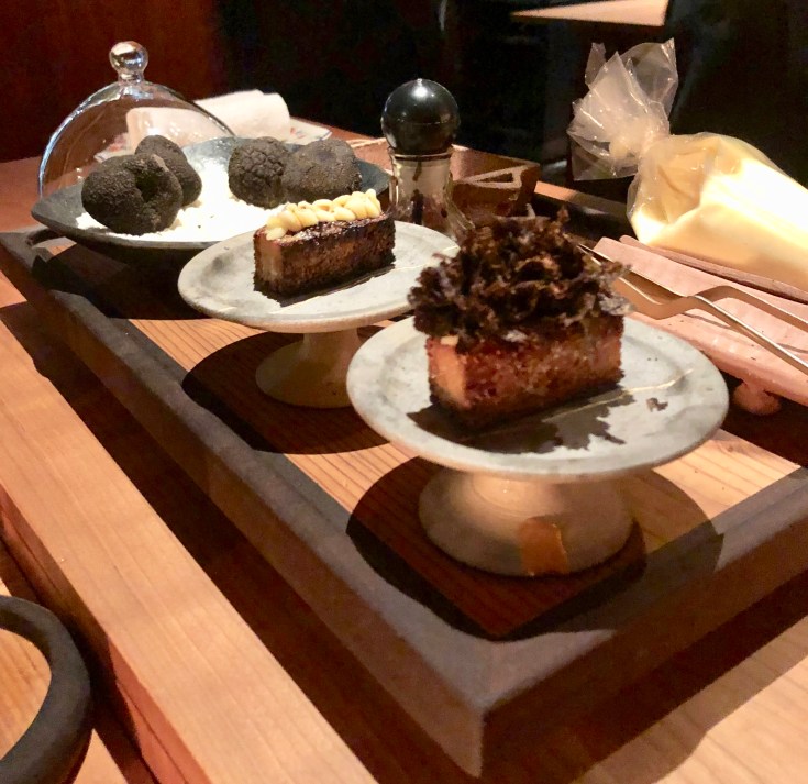 Menyn ändras med jämna mellanrum och efter säsong. Två av rätterna är återkommande på varje meny.  Det är havskräftan på krispigt ris (koshihikari) med en smör och ingefära emulsion som är helt fantastisk och deras ”french toast” – smörstekt brioche toppad med ”vacche rose” , och massor med färskhyvlad tryffel från Australien.
