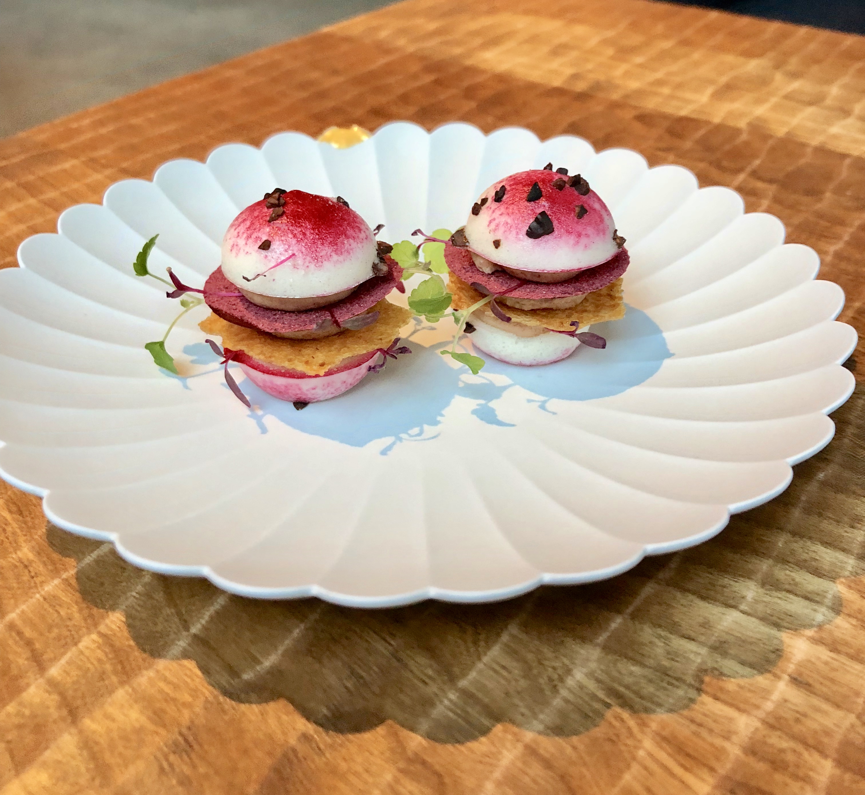 Macaron, fågellever, körsbärspuré & bittra kakaobönor.
