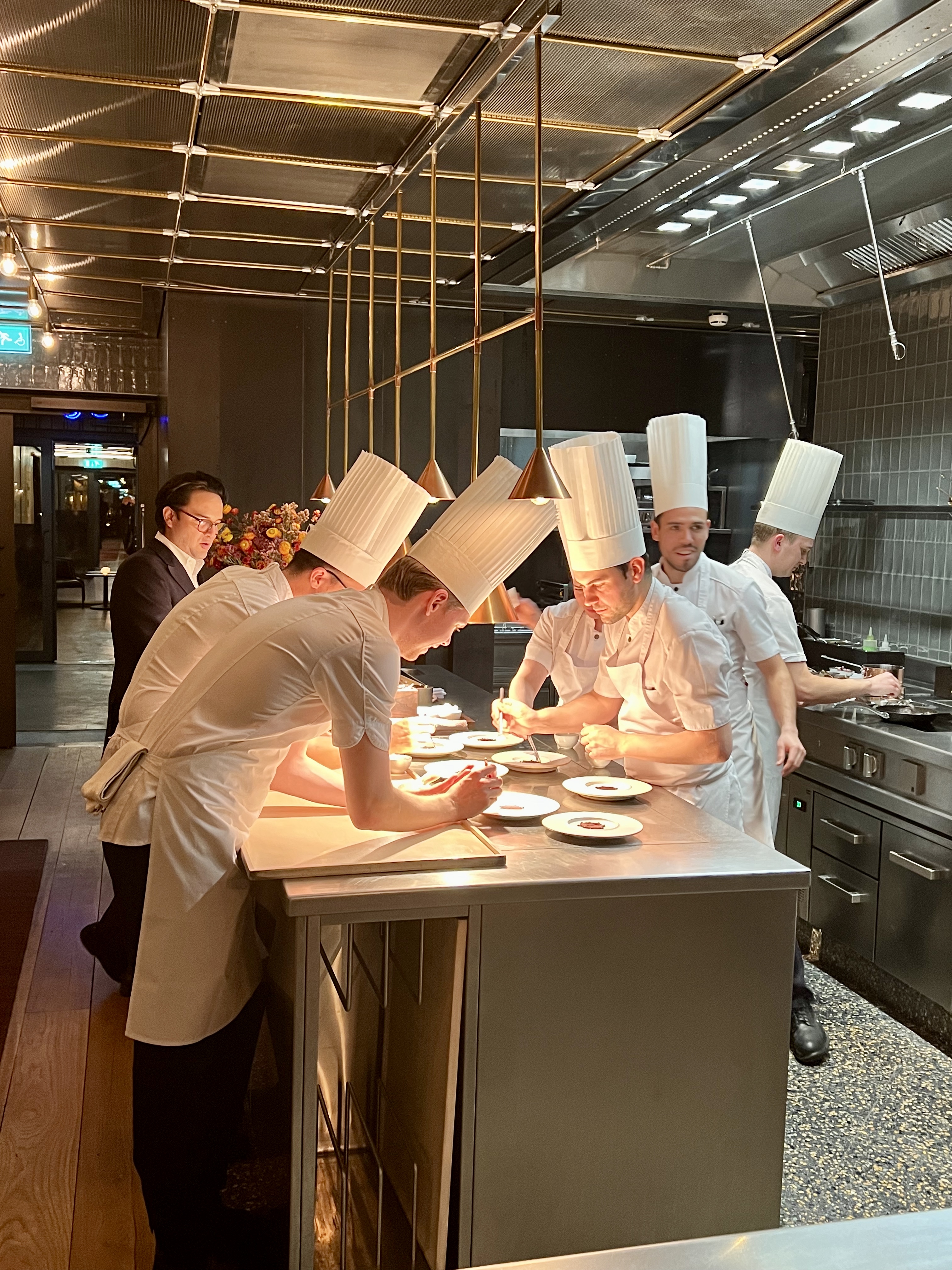 När vi anländer hälsas vi välkomna och slussas vidare in i lokalen, förbi det öppna köket där man kan se allt som händer på de olika stationerna. Aktiviteten är hög och mina förväntningar stiger ju mer vi närmar oss vårt bord. Vi tillfrågas vad vi önskar att dricka och jag brukar välja vinpaketet vilket jag gjorde även denna gång.