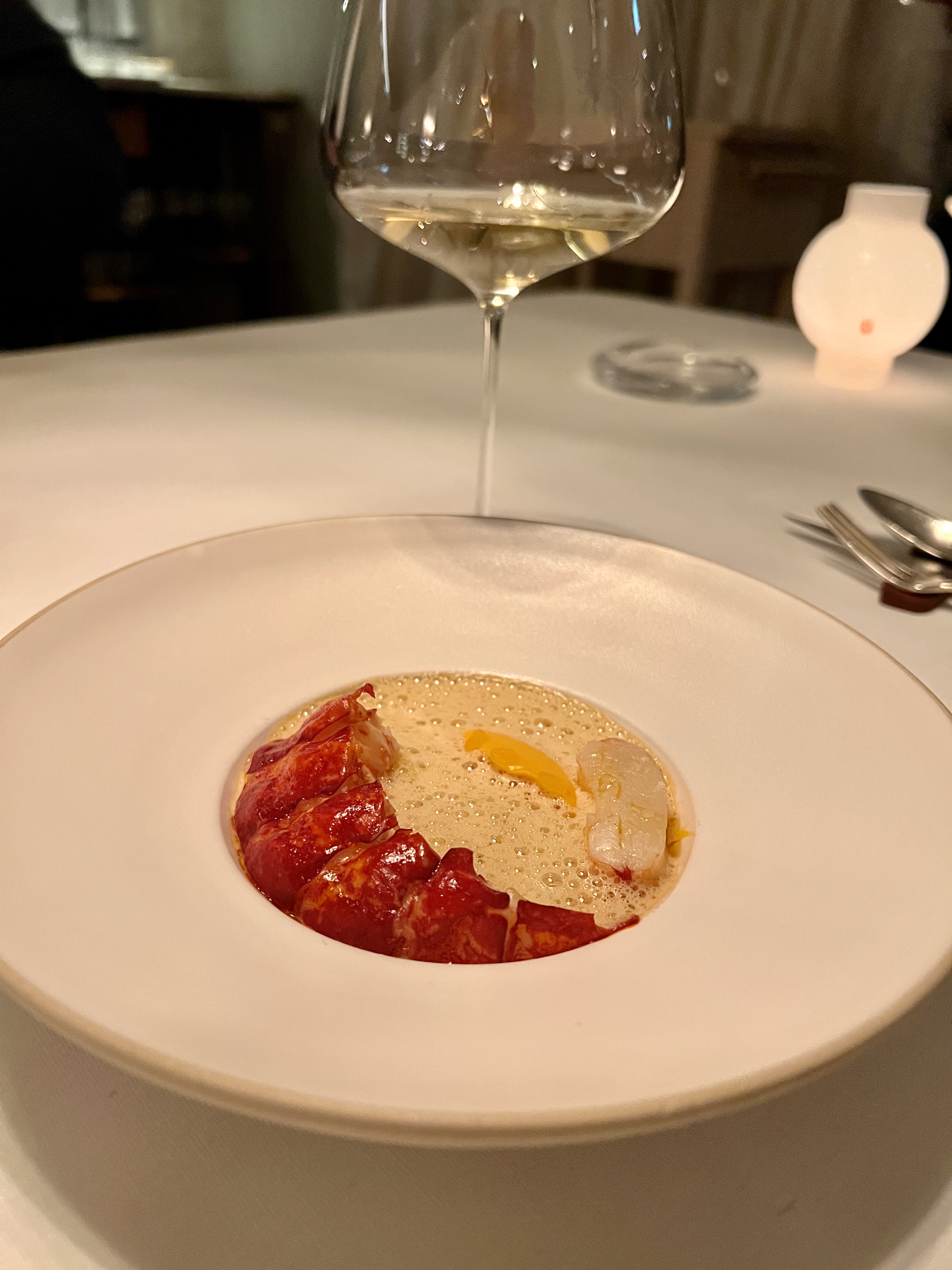 Smörpocherad hummer, hokkaidopumpa, vadouvan, vitlök och spansk peppar.