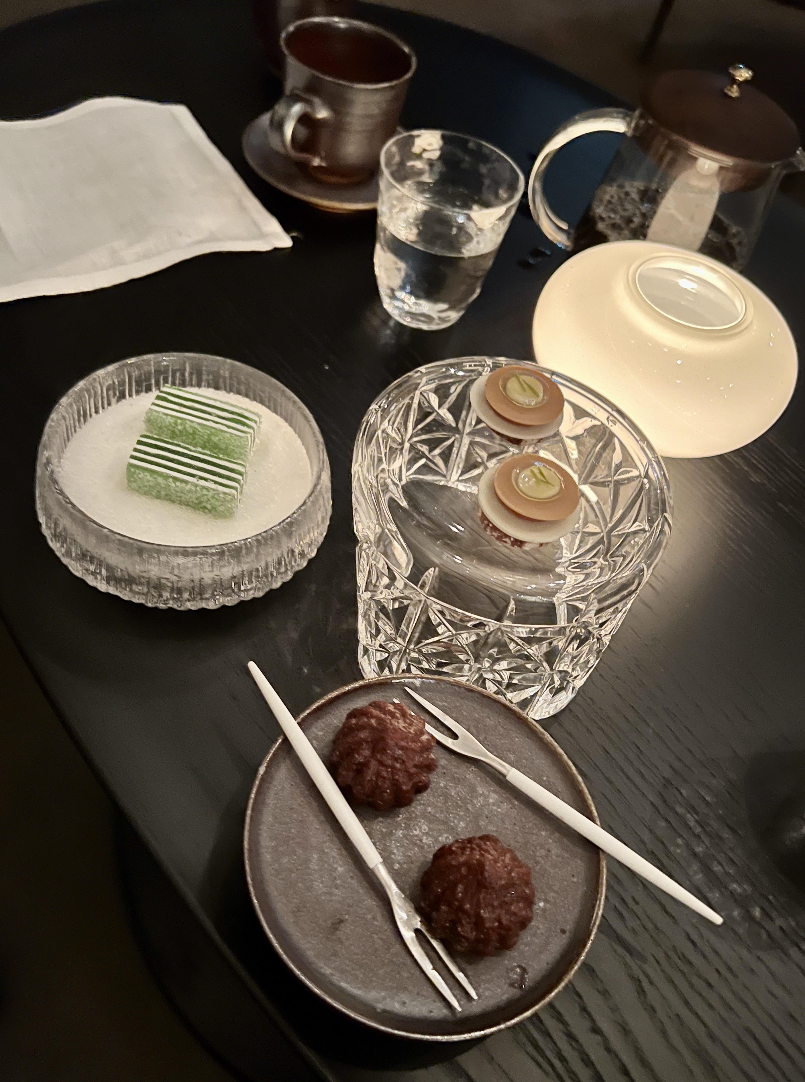Efter middagen kan ni ta kaffe/te/avec i baren eller utomhus om vädret tillåter. Till det serveras deras praliner. Om man inte orkar äta pralinerna kan ni be om att få ta med dem hem.