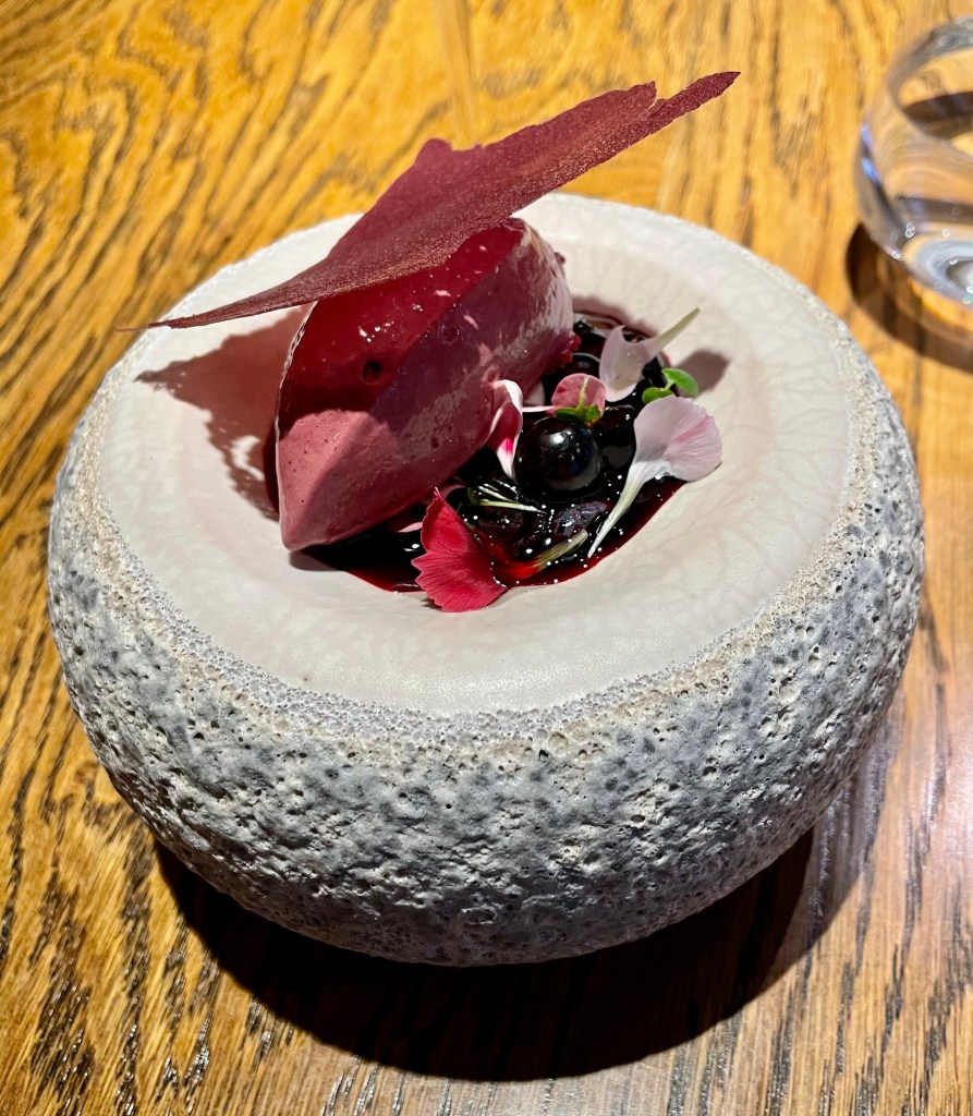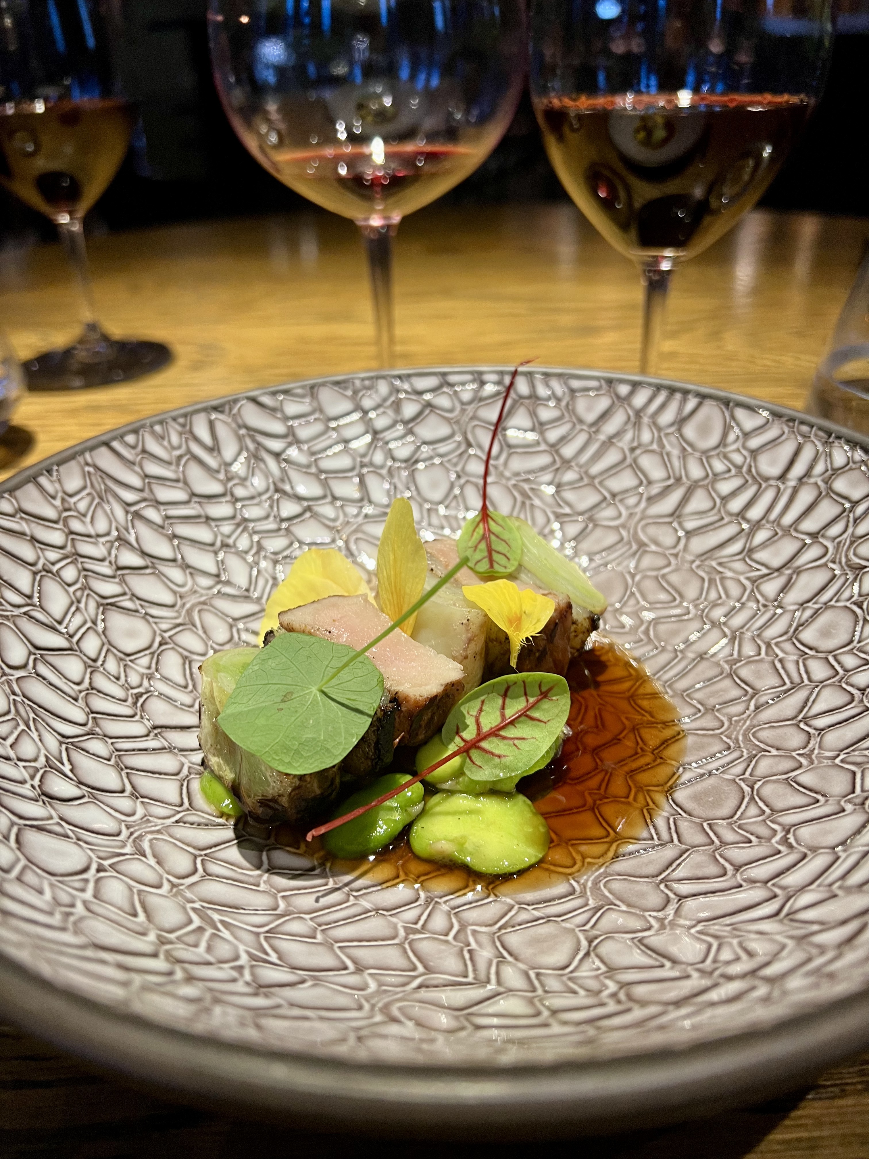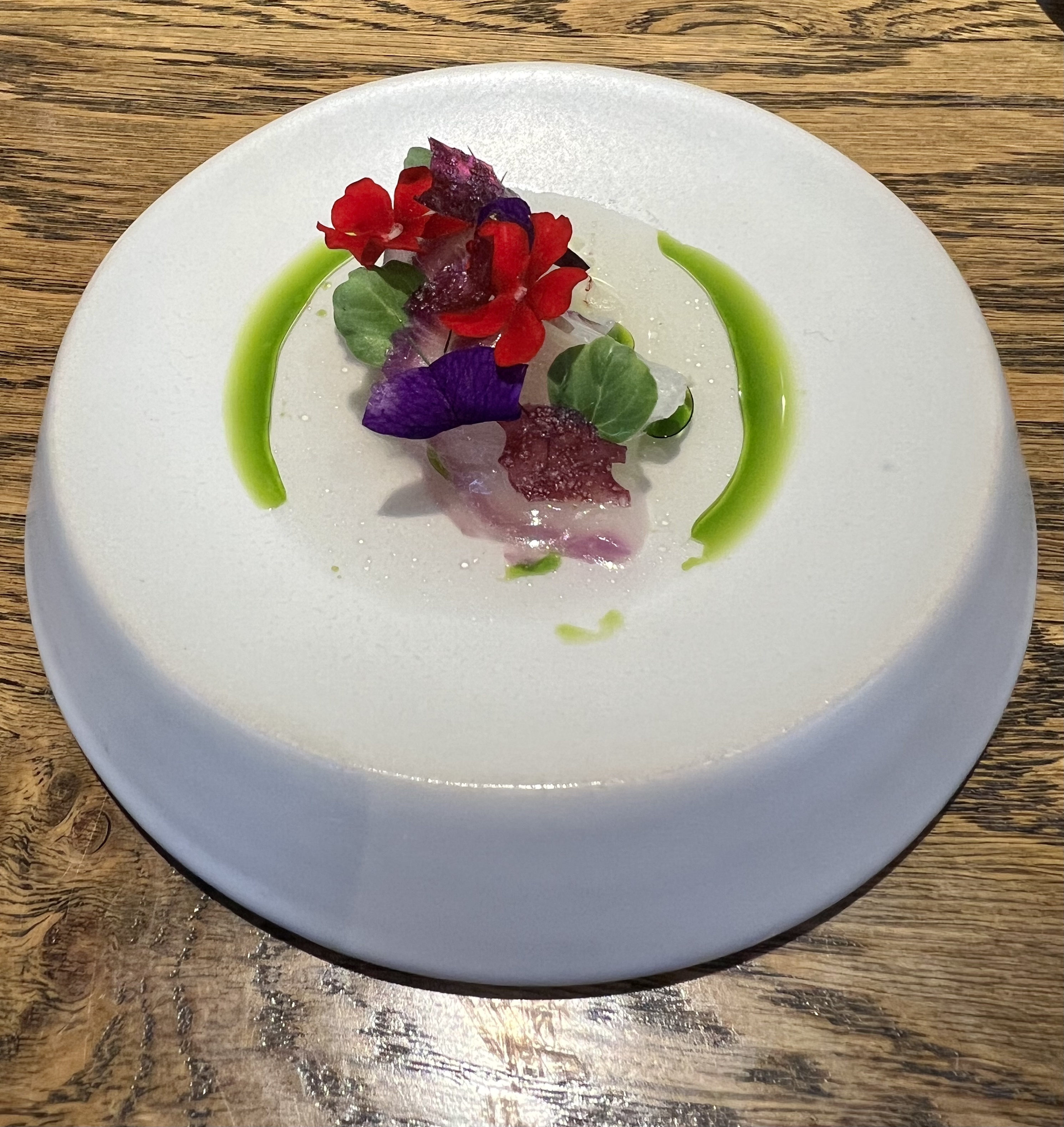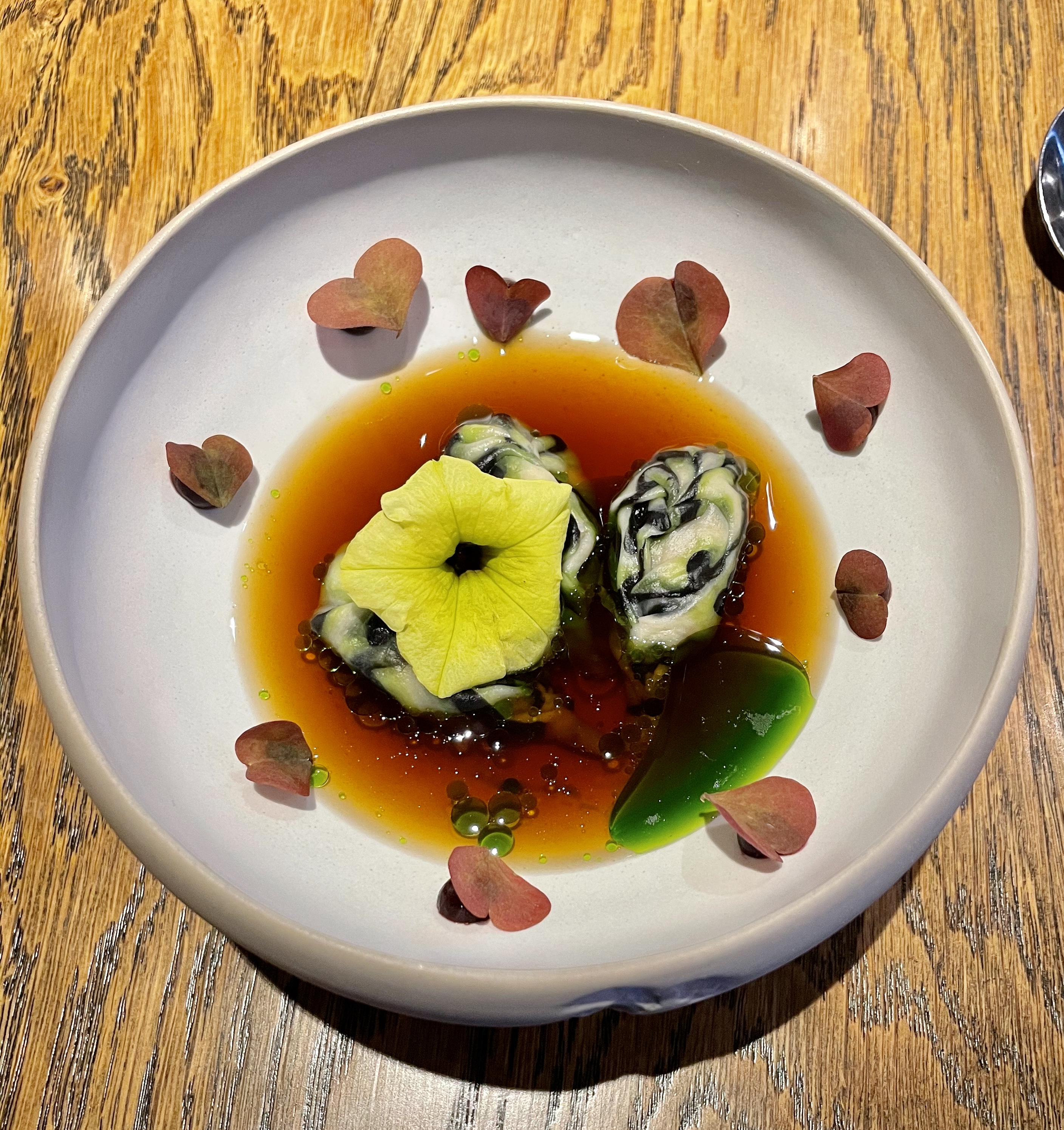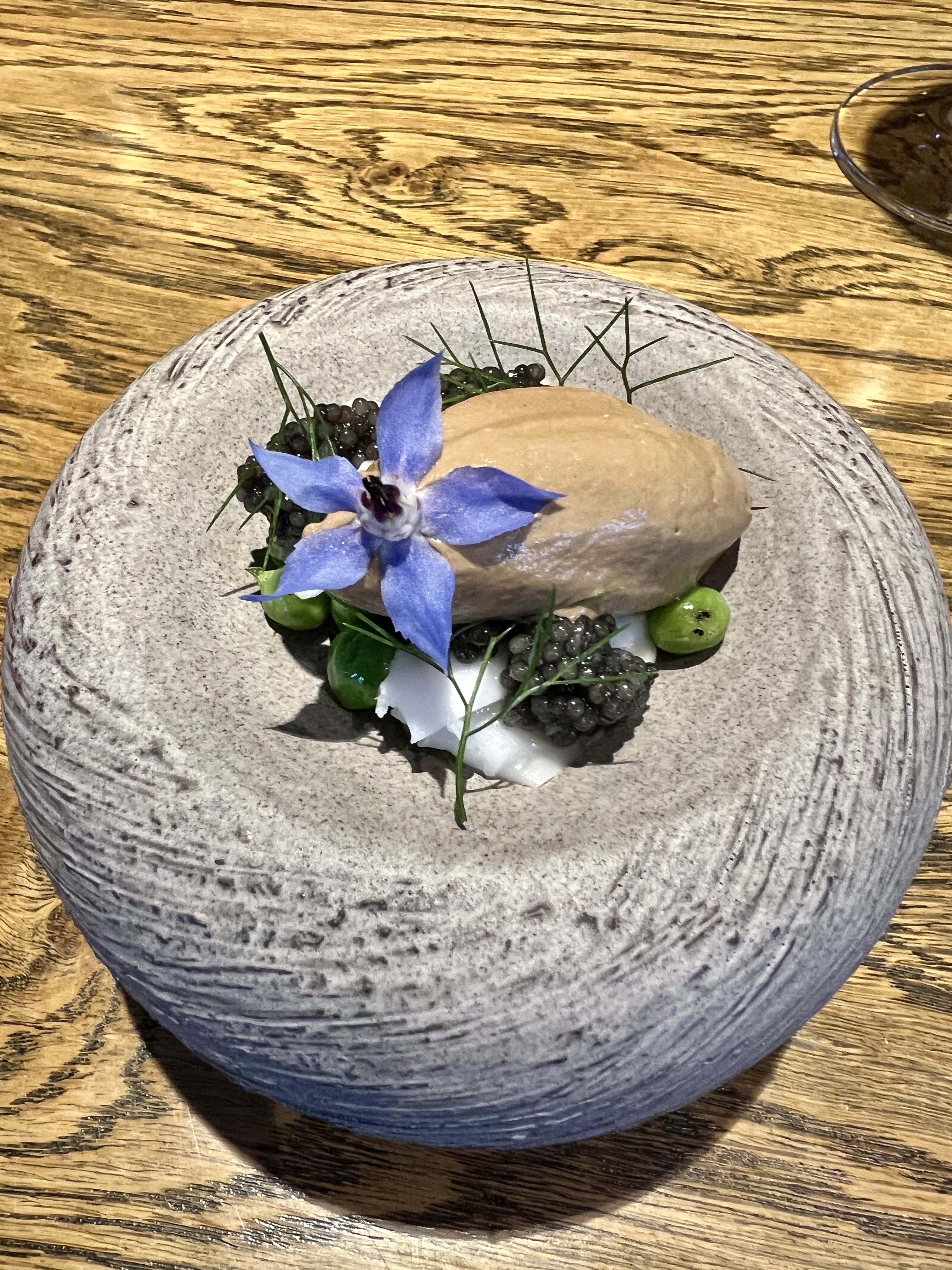 Vi placeras vid vårt bord och välkomnas av Max. Till 10 rätters avsmakningsmenyn tar vi vinpaketet som inleds med en champagne. Det finns även ett alkoholfritt alternativ med egen producerade juicer.