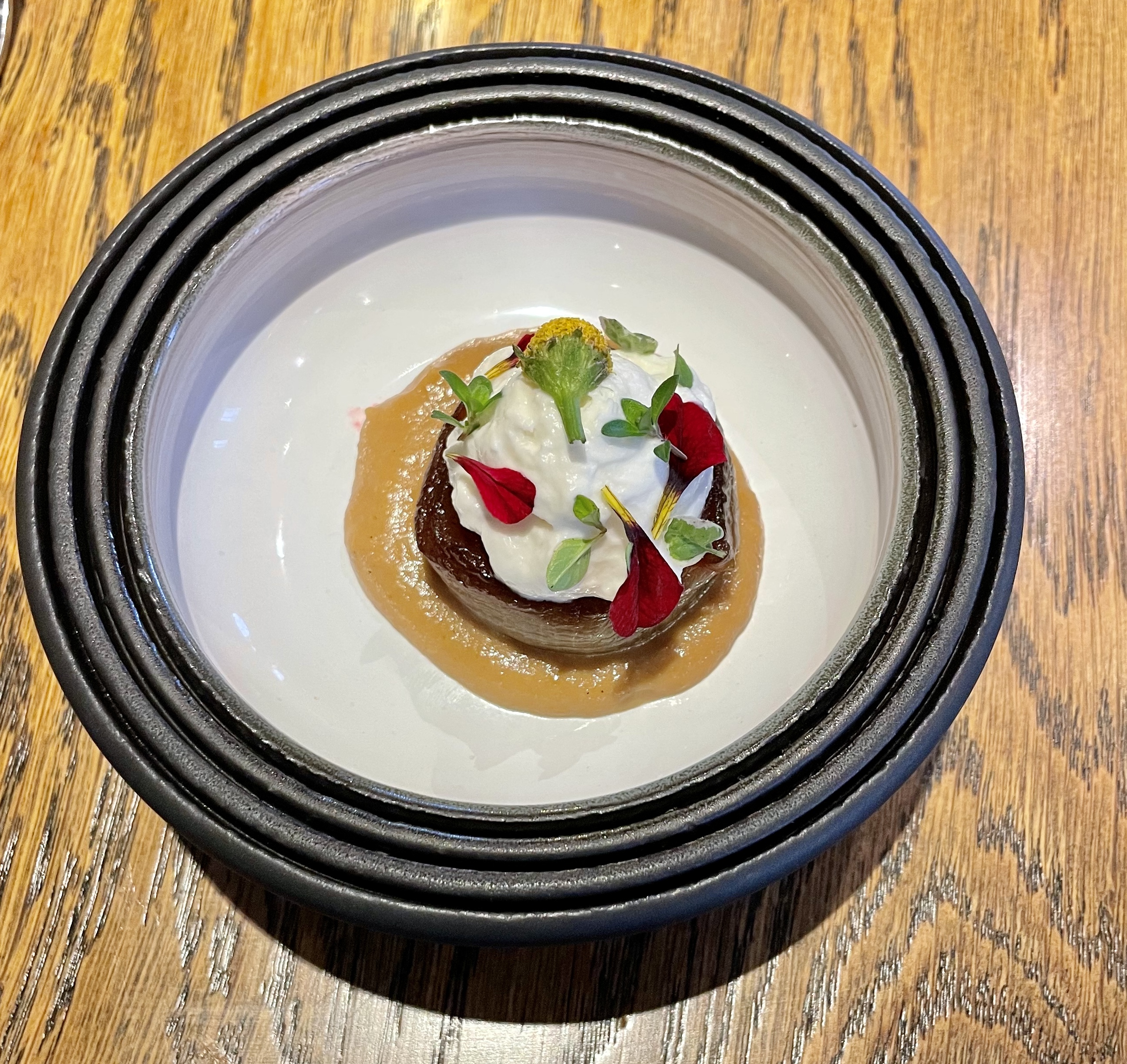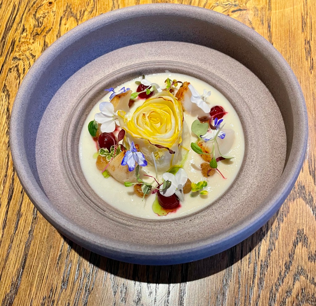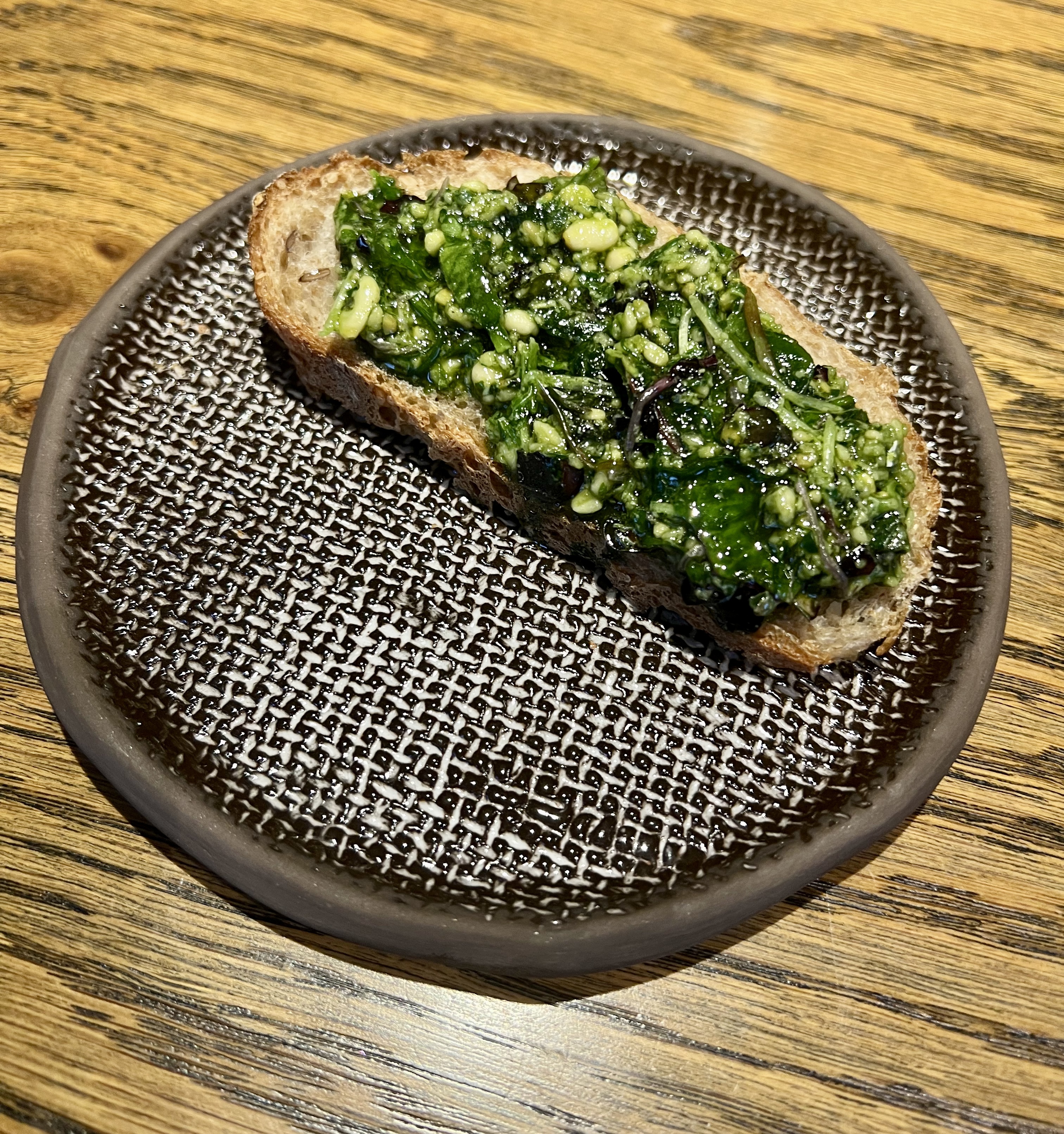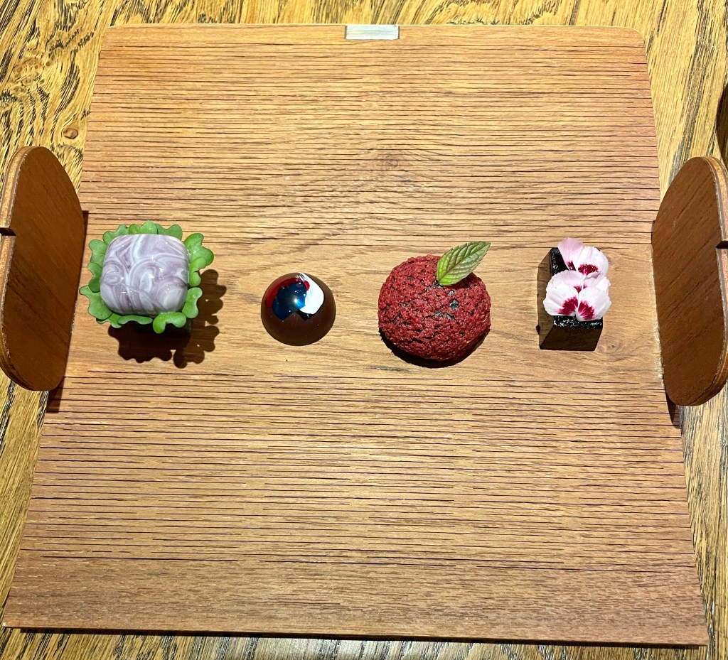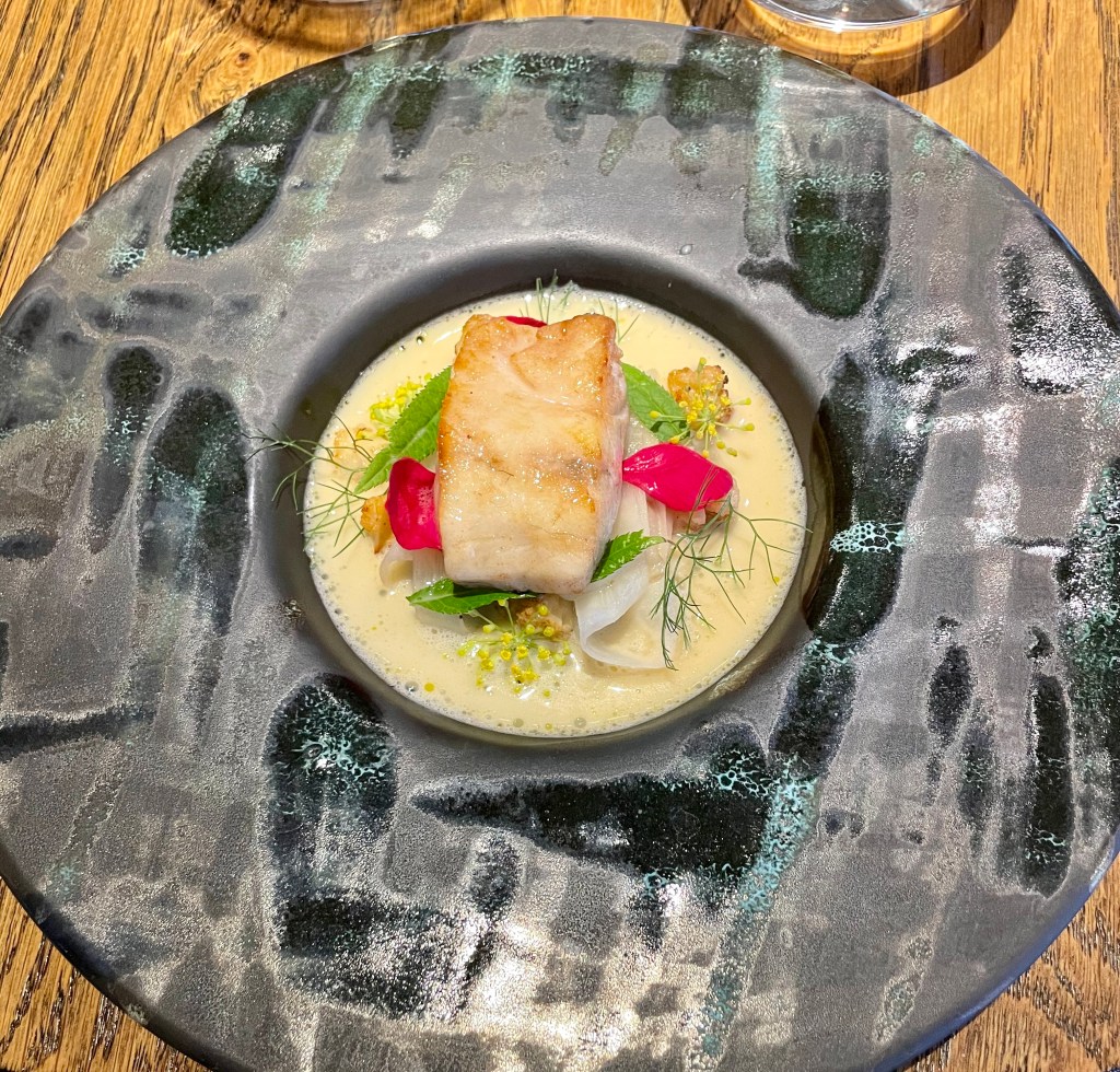 Vi placeras vid vårt bord och välkomnas av Max. Till 10 rätters avsmakningsmenyn tar vi vinpaketet som inleds med en champagne. Det finns även ett alkoholfritt alternativ med egen producerade juicer.